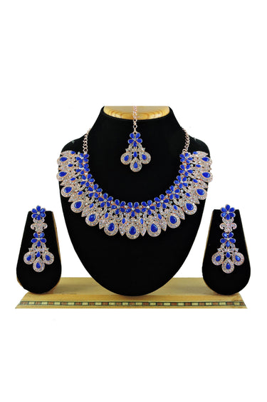 Blue Color Patterned Alloy Necklace with Earrings and Mang Tikka
