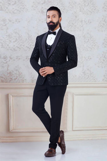 Gorgeous Black Self Design Slim Fit Tuxedo Party Suit For Men