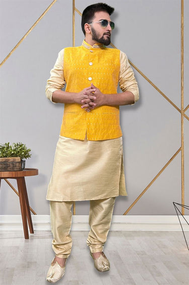 Art Silk Readymade Designer Men Kurta Pyjama With Yellow Color Jacket