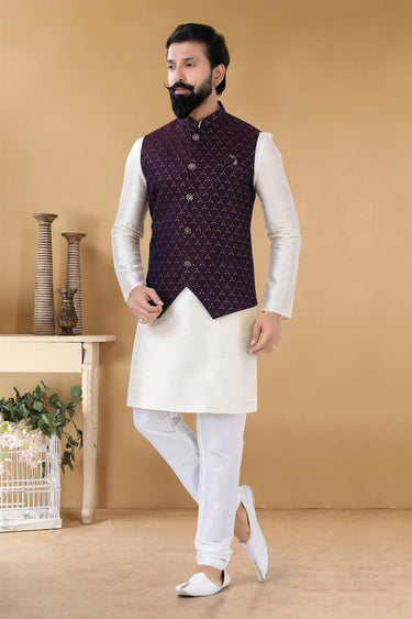 Attractive Off White Color Art Silk Fabric Function Wear Fancy Readymade Kurta Pyjama With Jacket