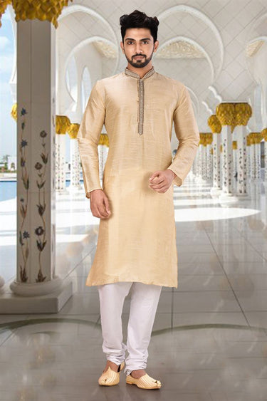 Beige Color Artistic Readymade Men Kurta Pyjama For Wedding Wear
