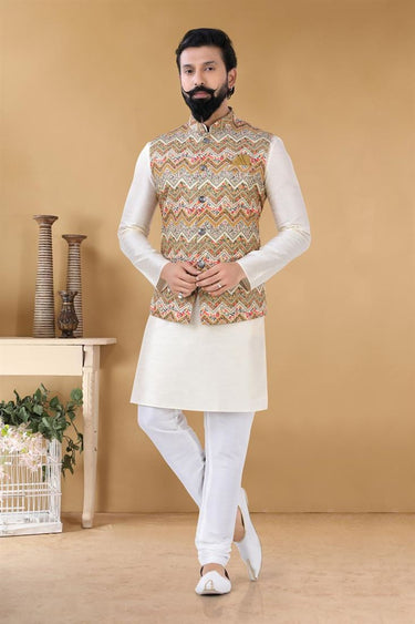 Majestic Off White Color Art Silk Fabric Wedding Wear Designer Readymade Kurta Pyjama With Jacket