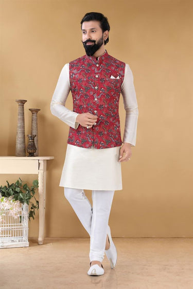 Splendiferous Off White Color Art Silk Fabric Sangeet Wear Trendy Readymade Kurta Pyjama With Jacket