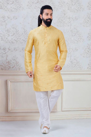 Stunning Yellow Color Art Silk Fabric Festive Wear Trendy Readymade Kurta Pyjama For Men