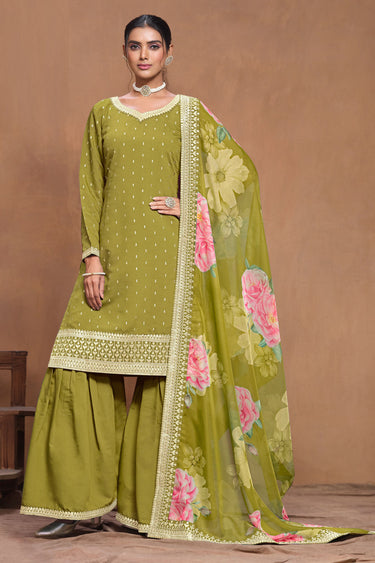 Classic Green Color Palazzo Suit With Floral Design Dupatta In Art Silk Fabric