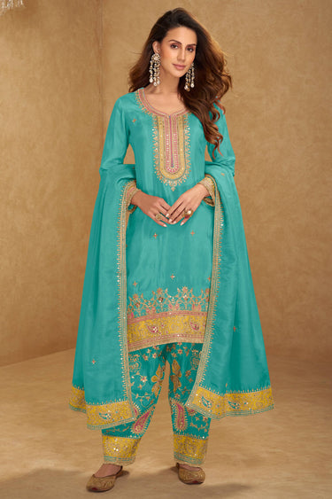 Cyan Art Silk Fancy Embroidered Function Wear Readymade Designer Salwar Suit