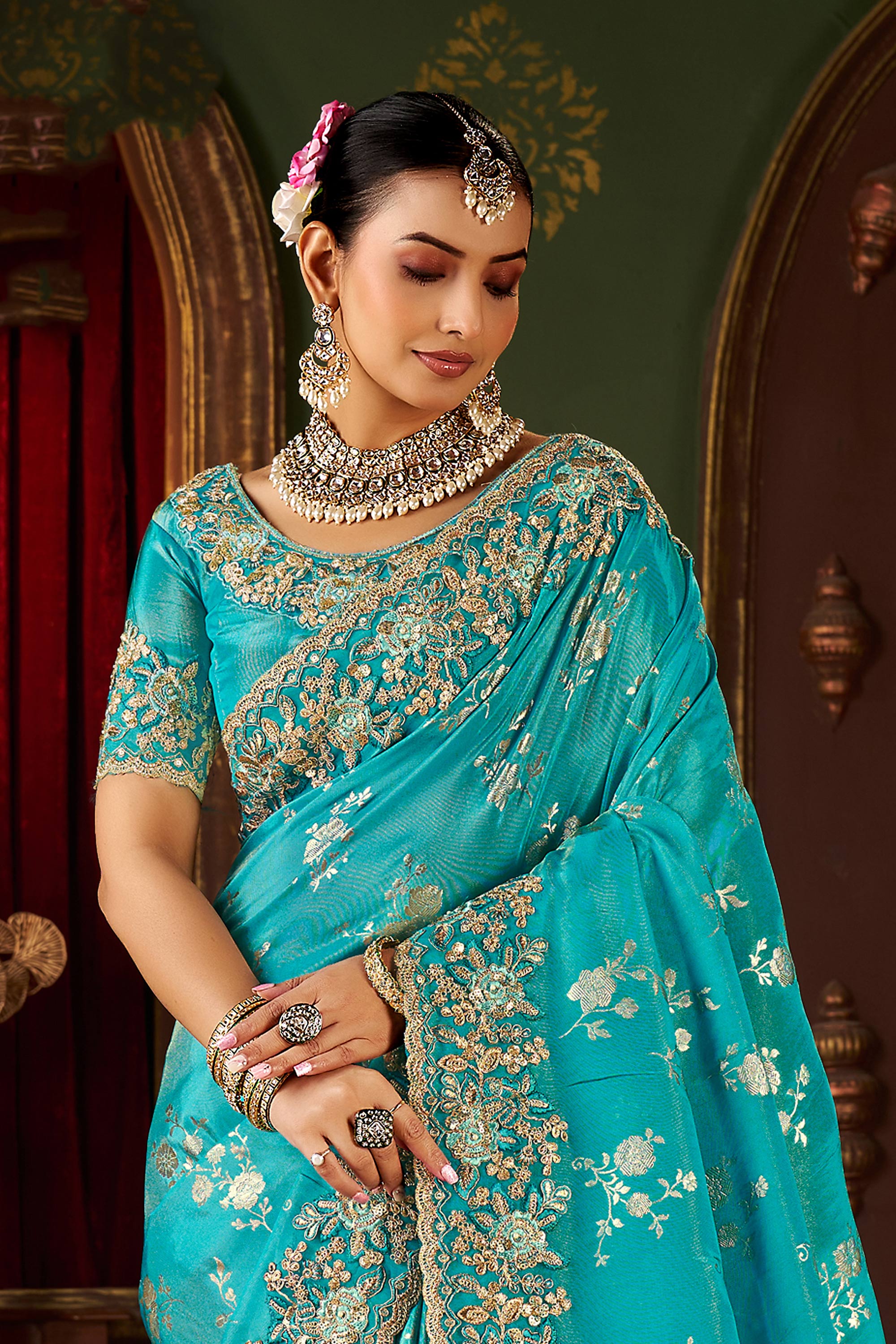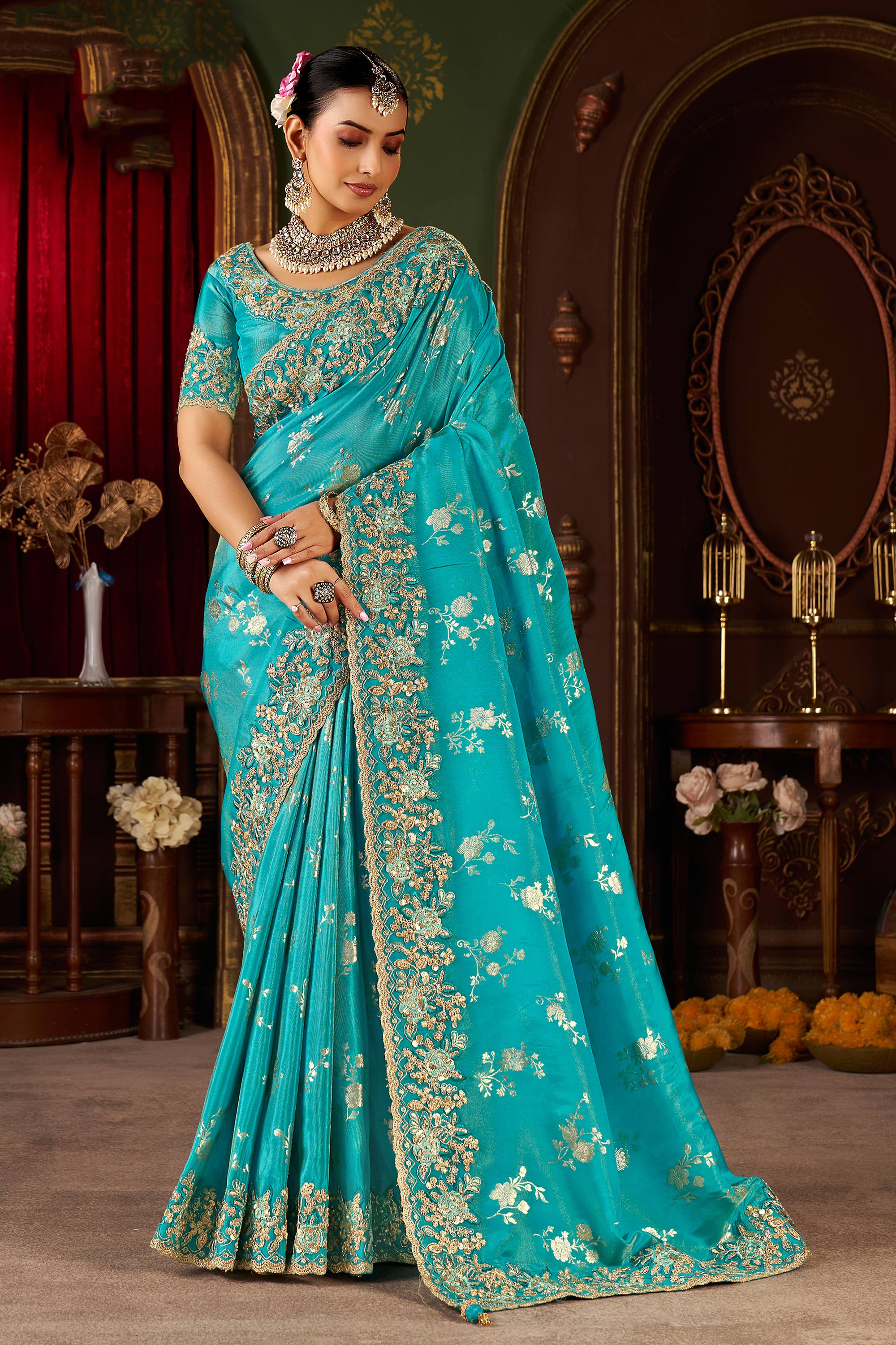 Art Silk Embroidered Border Work Cyan Wedding Wear Saree