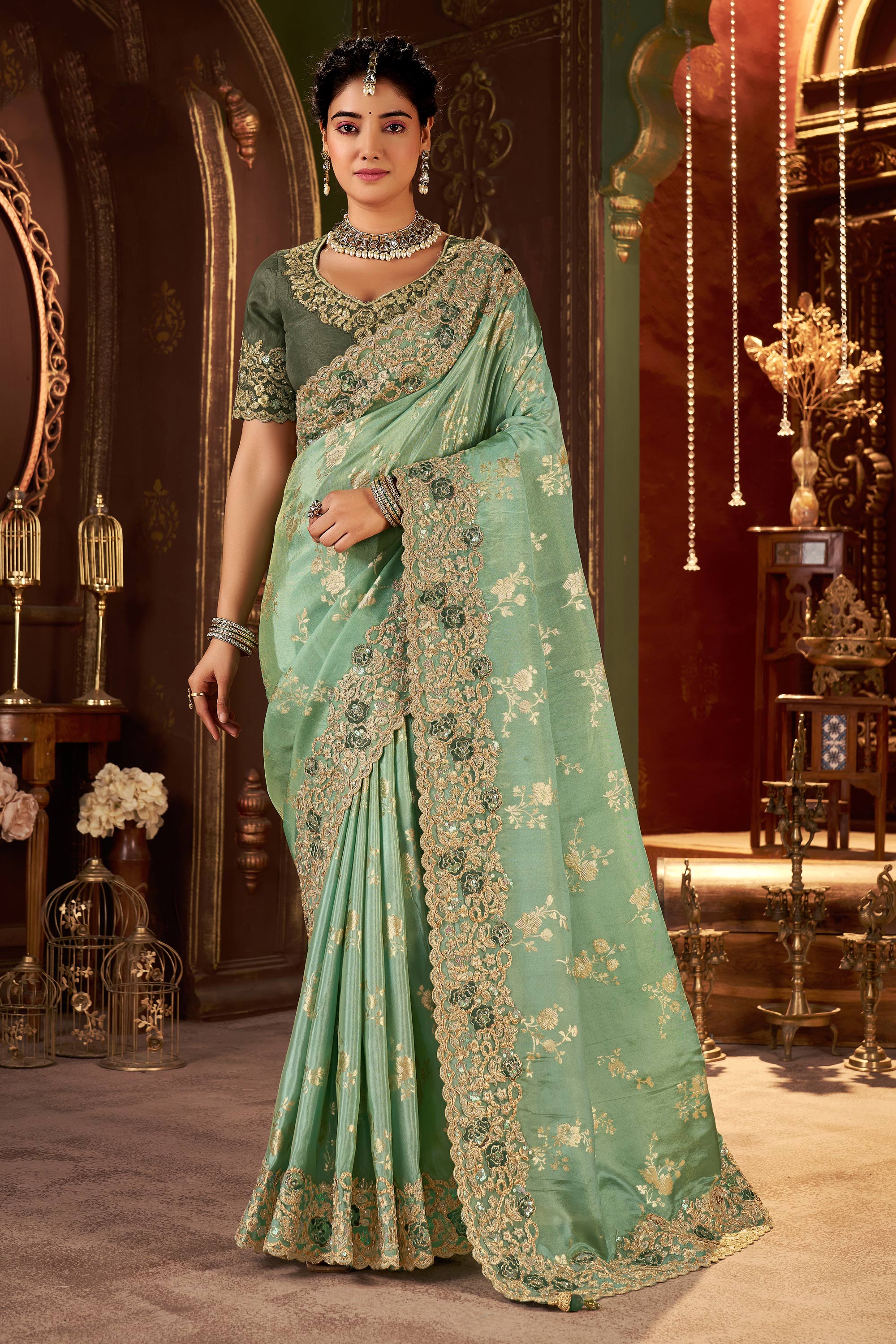 Art Silk Embroidered Border Work Sea Green Function Wear Saree
