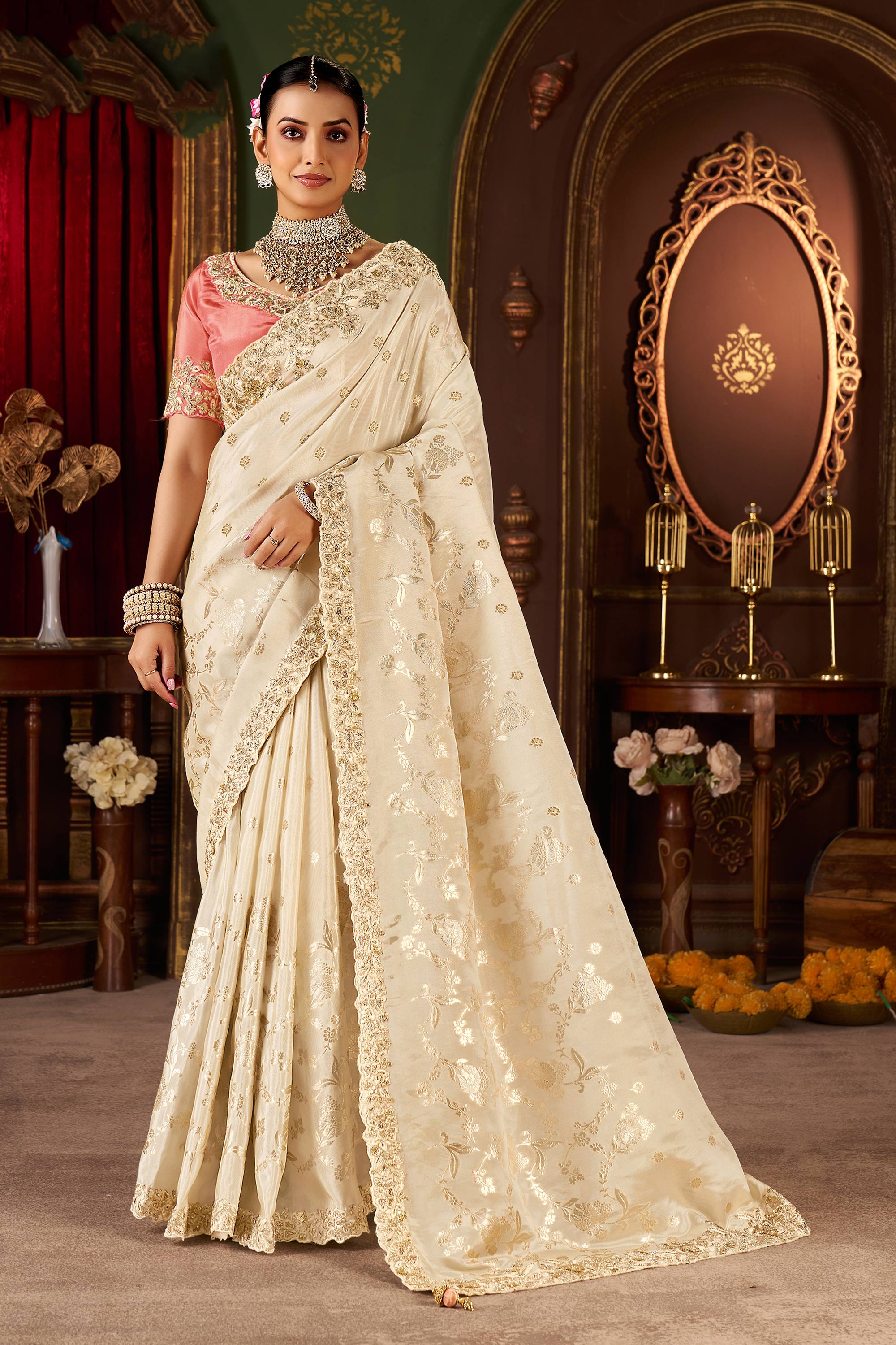 Embroidered Border Work Art Silk Beige Wedding Wear Saree