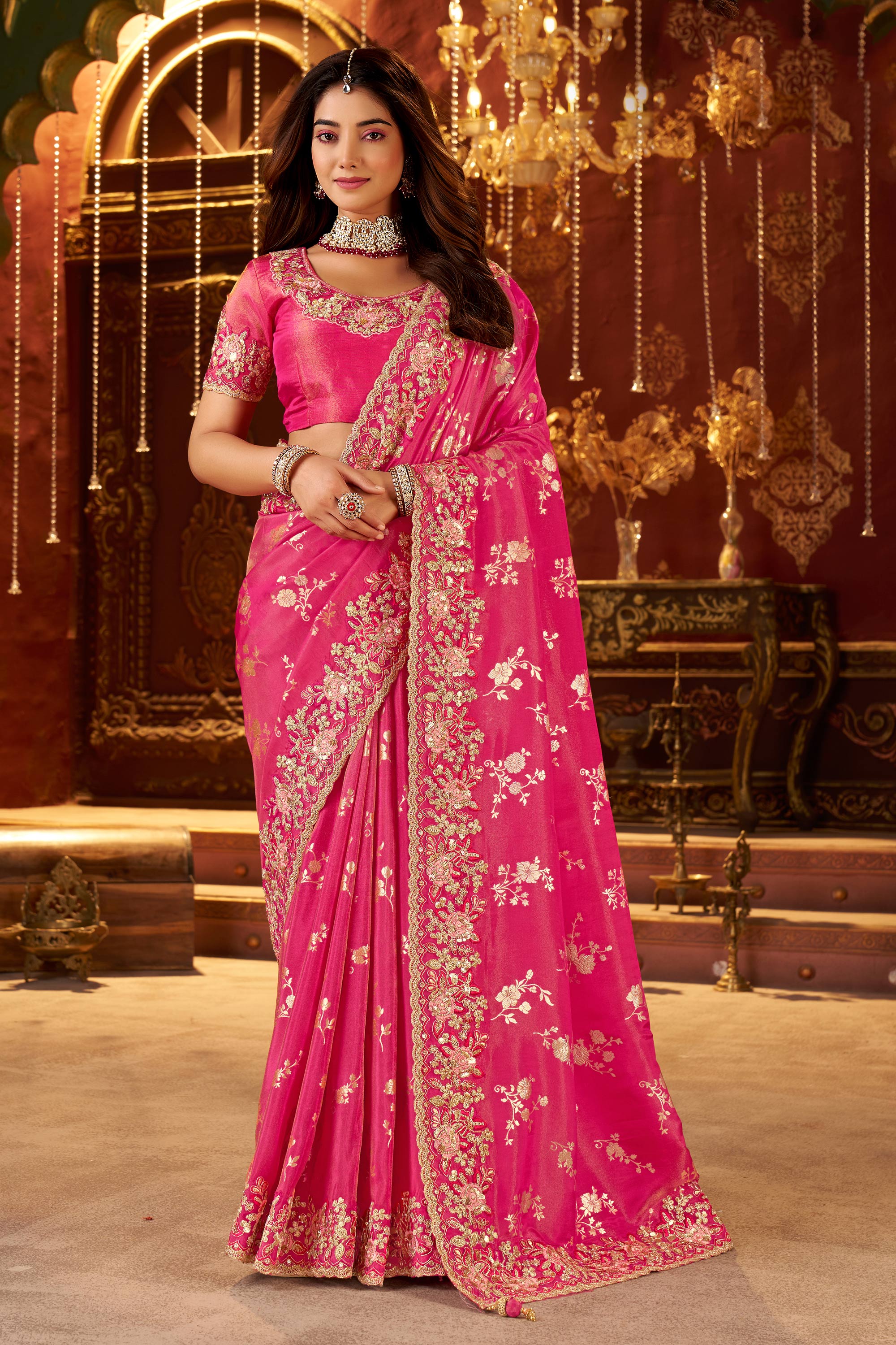 Elevate your traditional wardrobe with this designer Gorgeous Reach Silk Saree. Featuring luxurious heavy embroidery on the borders, this saree is perfect for weddings and other grand occasions. Crafted with care, the premium silk fabric ensures a comfortable and breathable feel while maintaining a polished, graceful look. The saree comes with an unstitched blouse that allows you to design your own statement outfit. Ideal for brides and those seeking standout fashion, this saree combines tradition with modern artistry, creating a look that is effortlessly charming. Celebrate in style and sophistication with this beautifully crafted masterpiece.