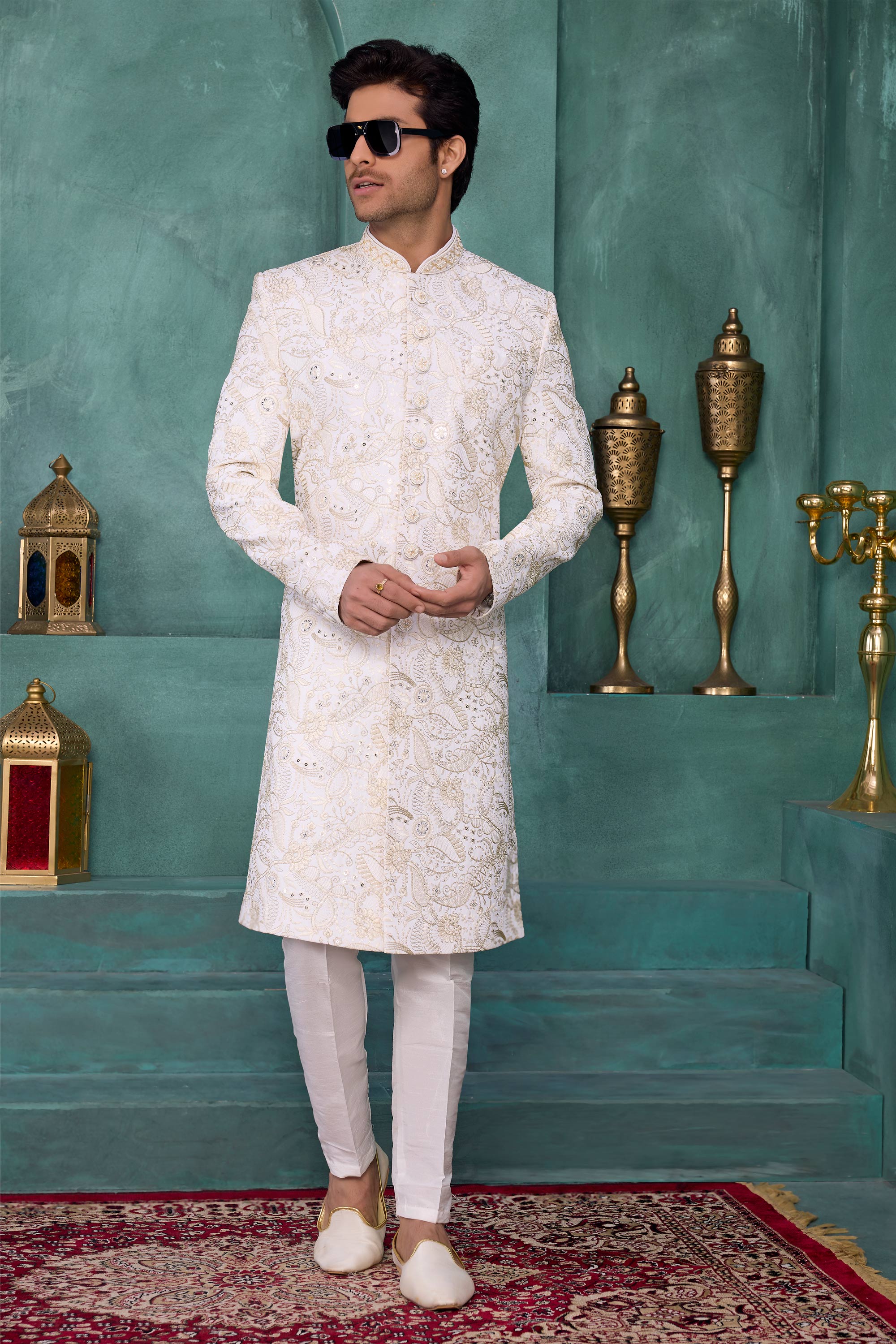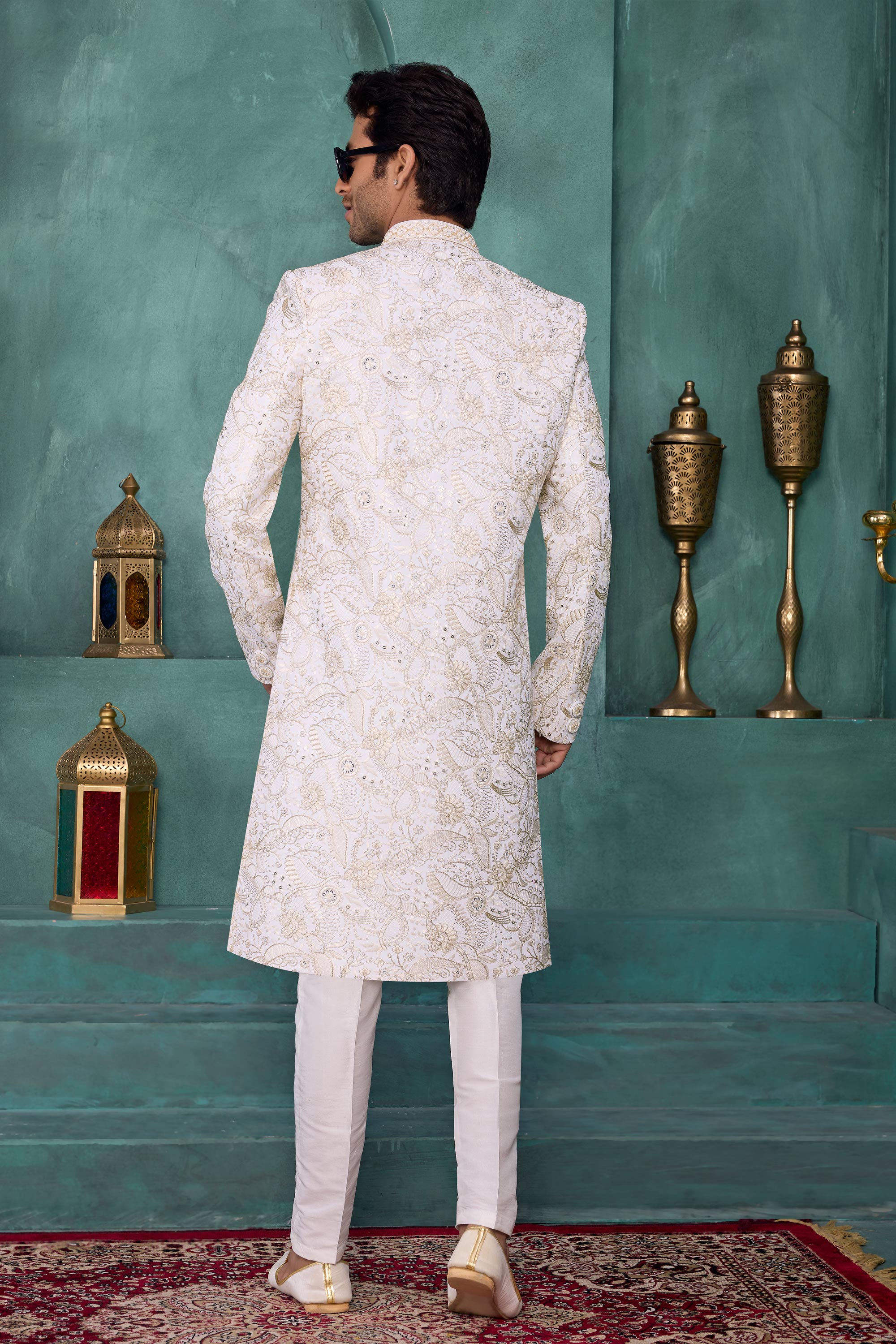 Cream Wedding Wear Art Silk Embroidered Readymade Sherwani For Men