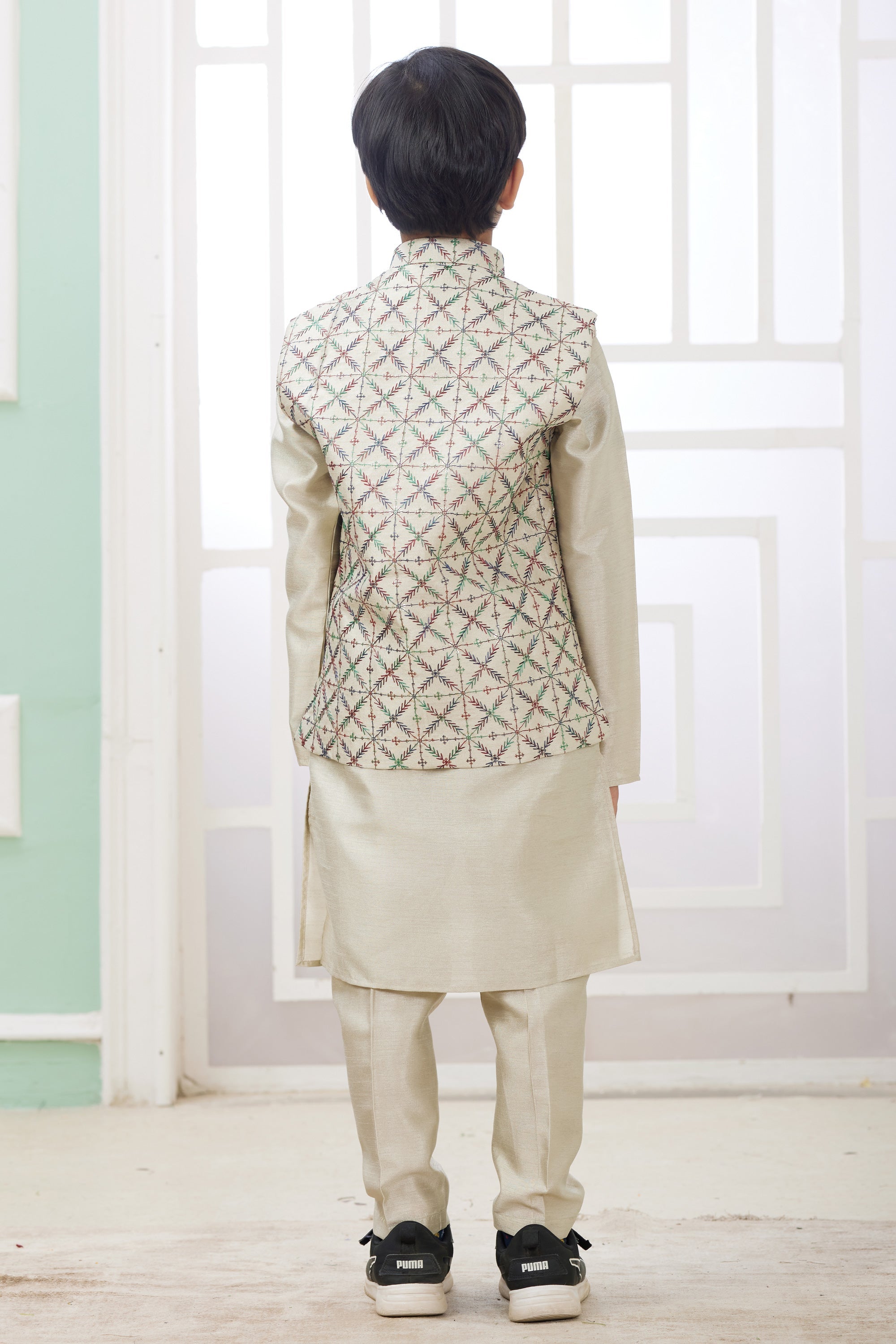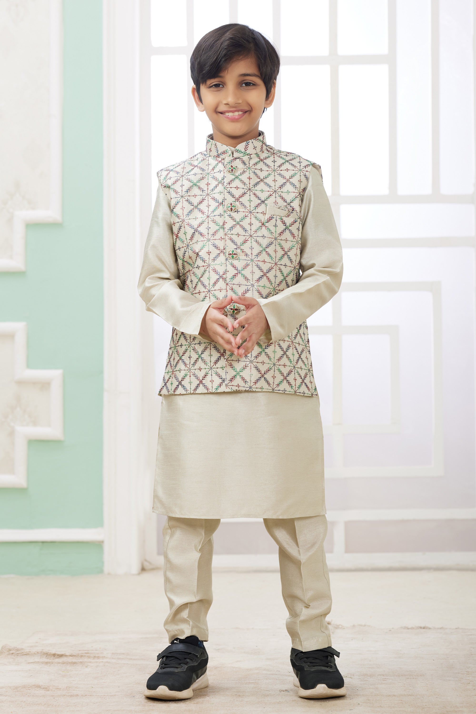 Art Silk Beige Occasion Wear Readymade Boys Kurta Pyjama With Designer Jacket