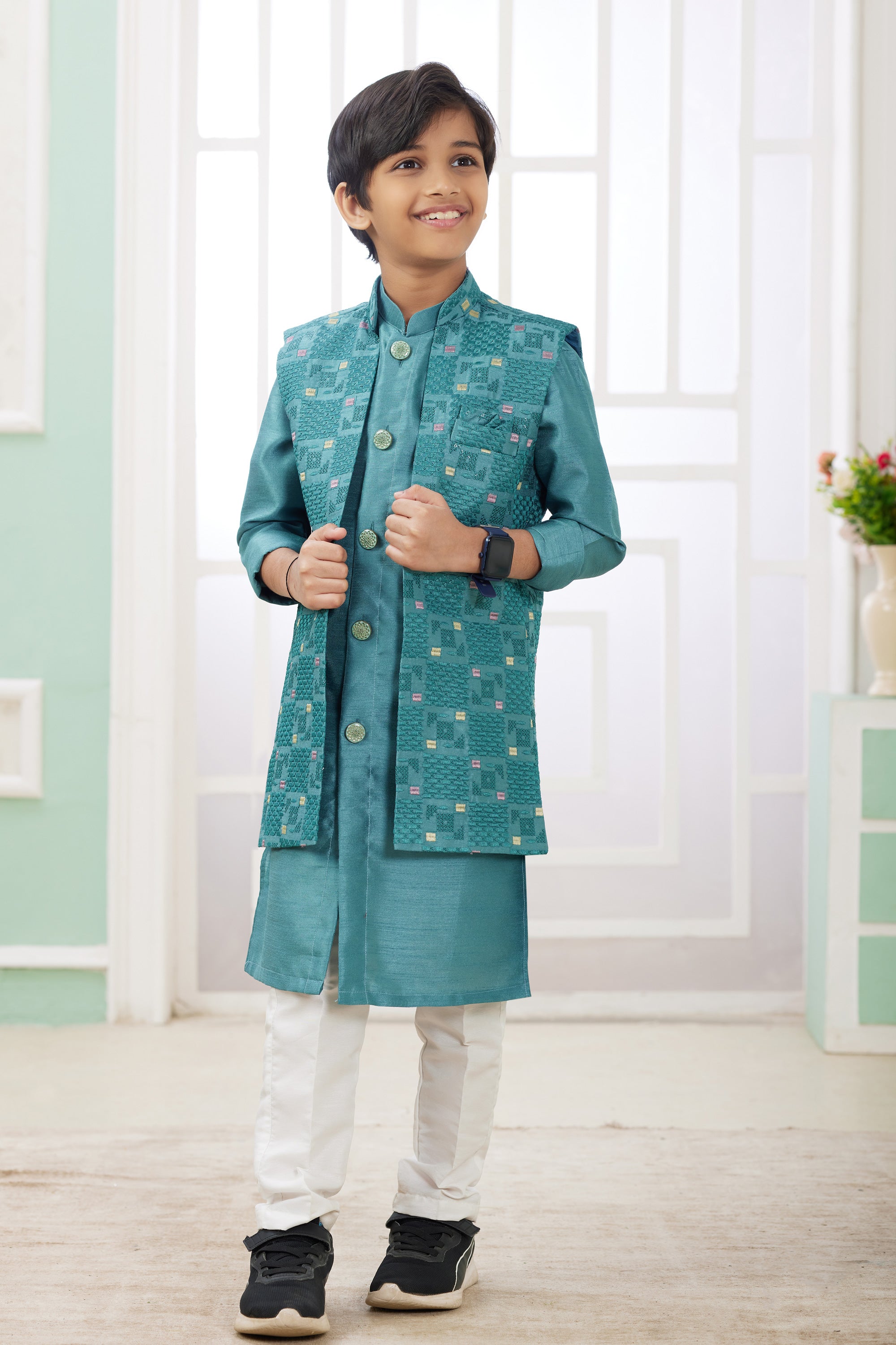 Art Silk Teal Boys Readymade Kurta Pyjama With Designer Jacket