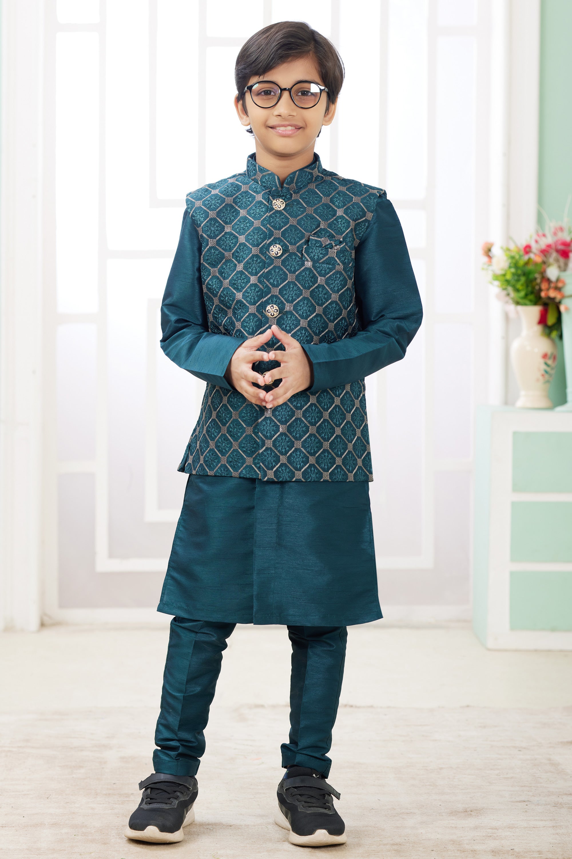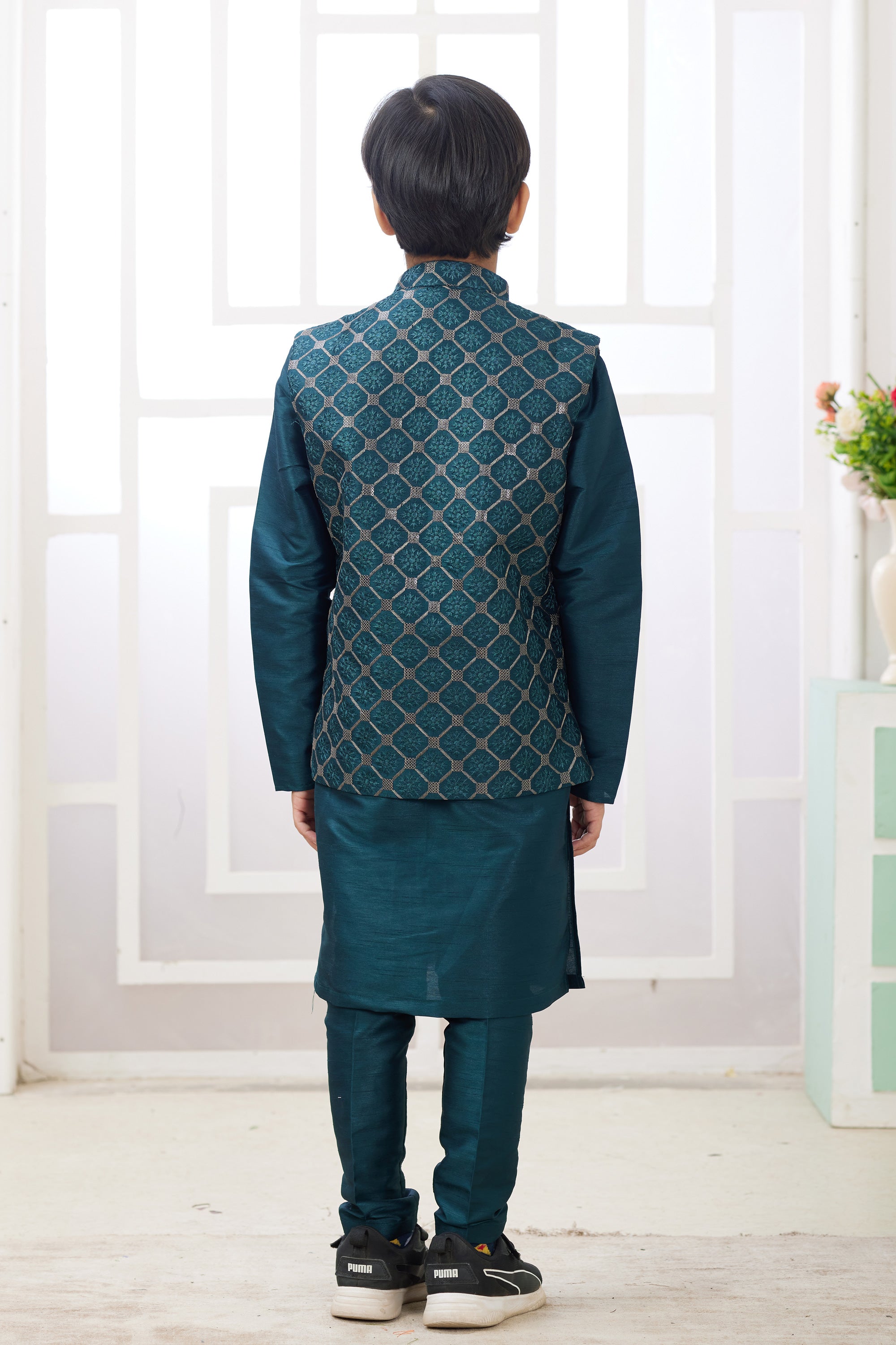 Art Silk Teal Function Wear Boys Stylish Readymade Kurta Pyjama With Designer Jacket