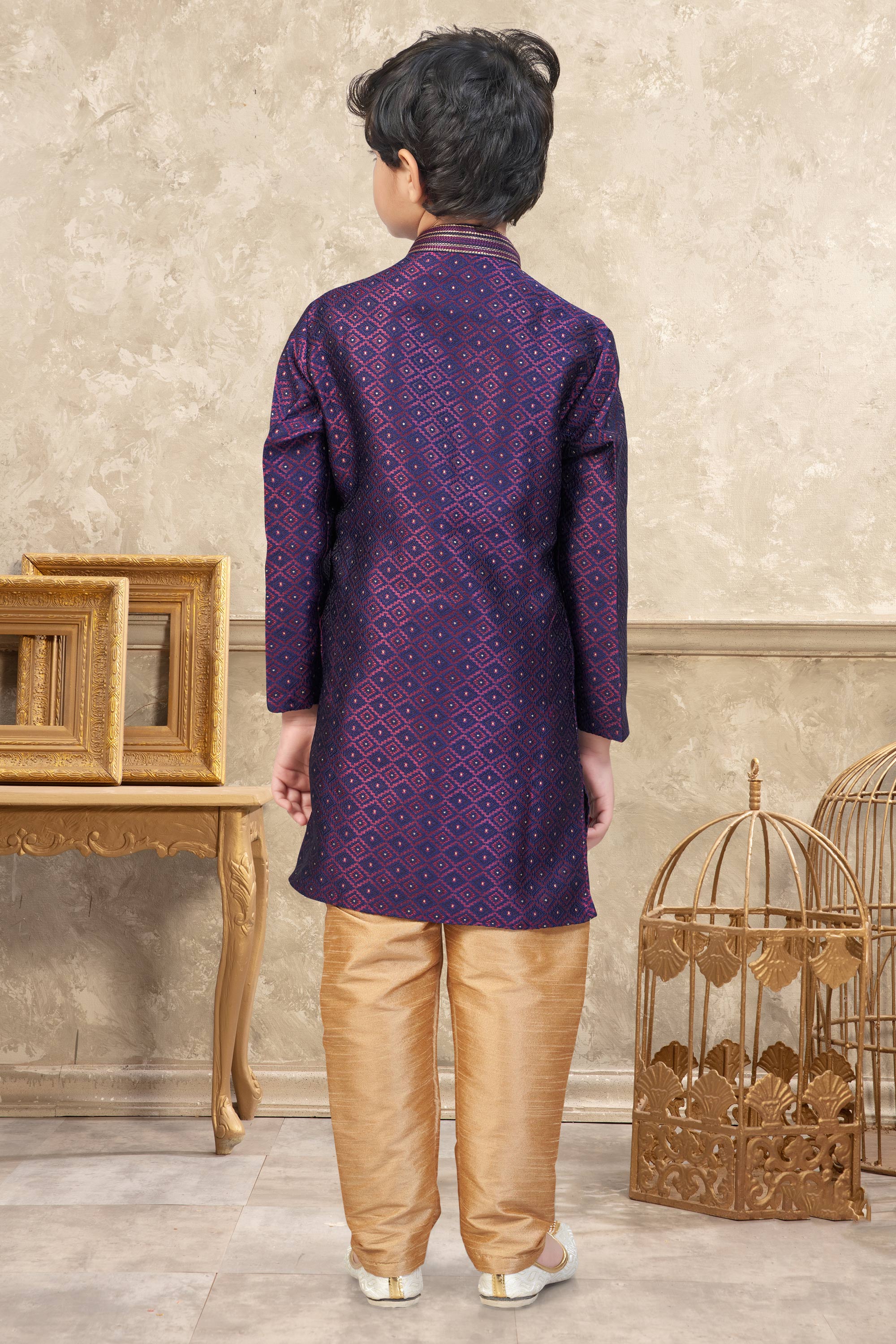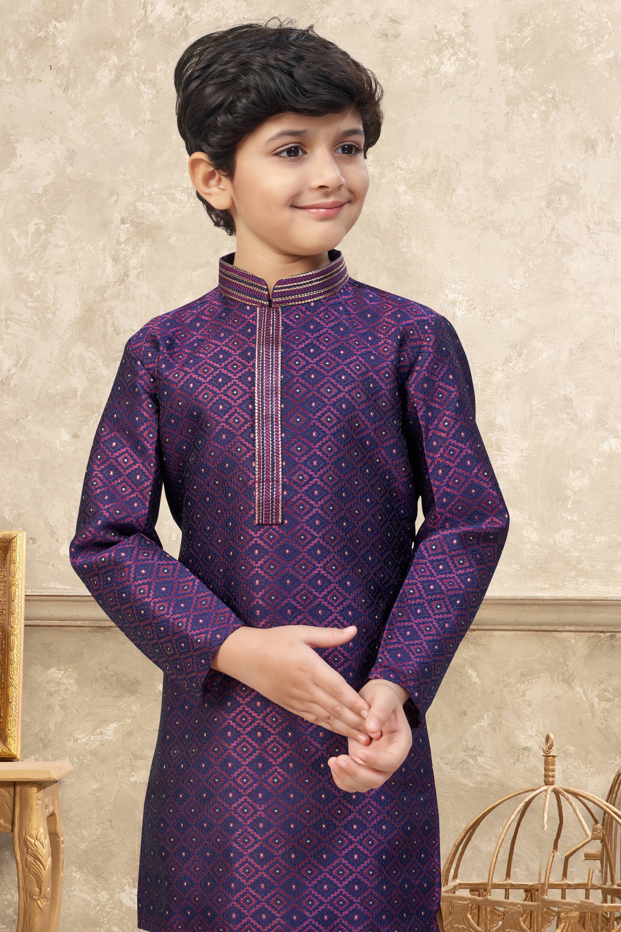 The kurta is crafted from premium Banarasi Jacquard fabric, featuring a rich texture and traditional appeal that adds a royal festive touch, while remaining soft and comfortable for kids to wear for long hours; please note that due to digital photography, slight color variations may occur.