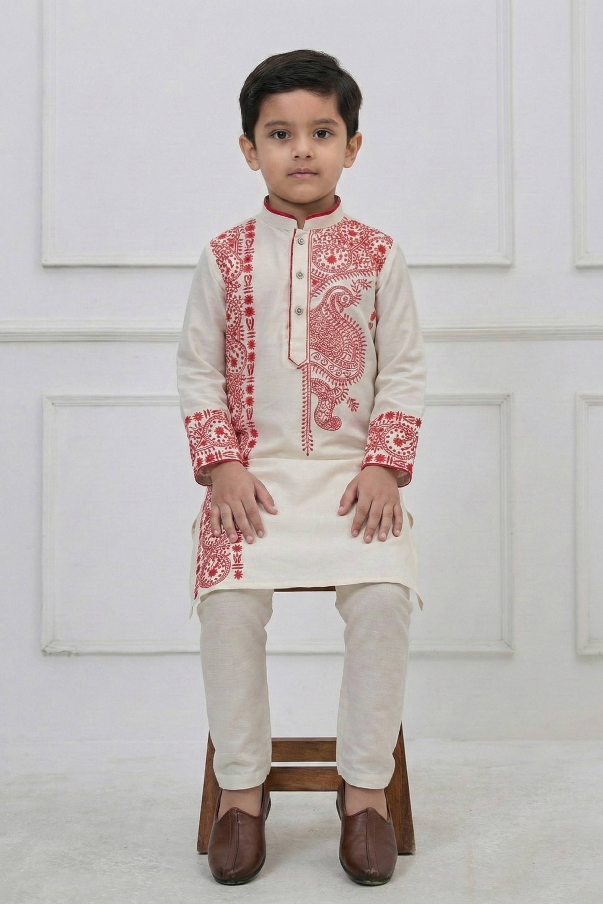 Off White Sangeet Wear Viscose Embroidered Readymade Kurta Pyjama For Boys