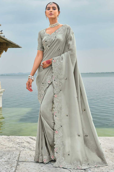 Banarasi Fabric Heavy Embroidered Work Mesmeric Saree In Grey Color