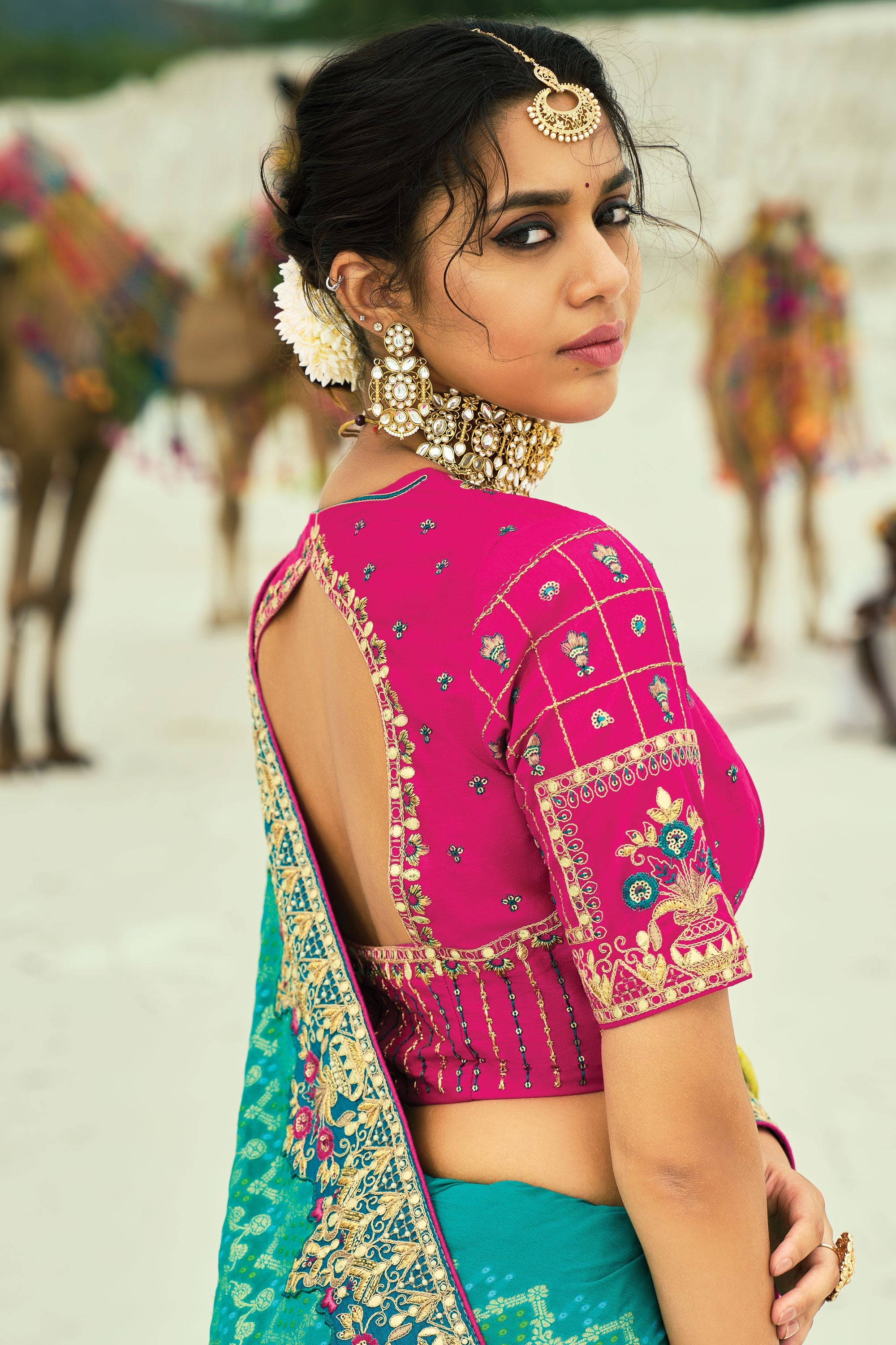 Bridal Style Yellow And Cyan Bandhej Saree With Pure Georgette And Heavy Border Work