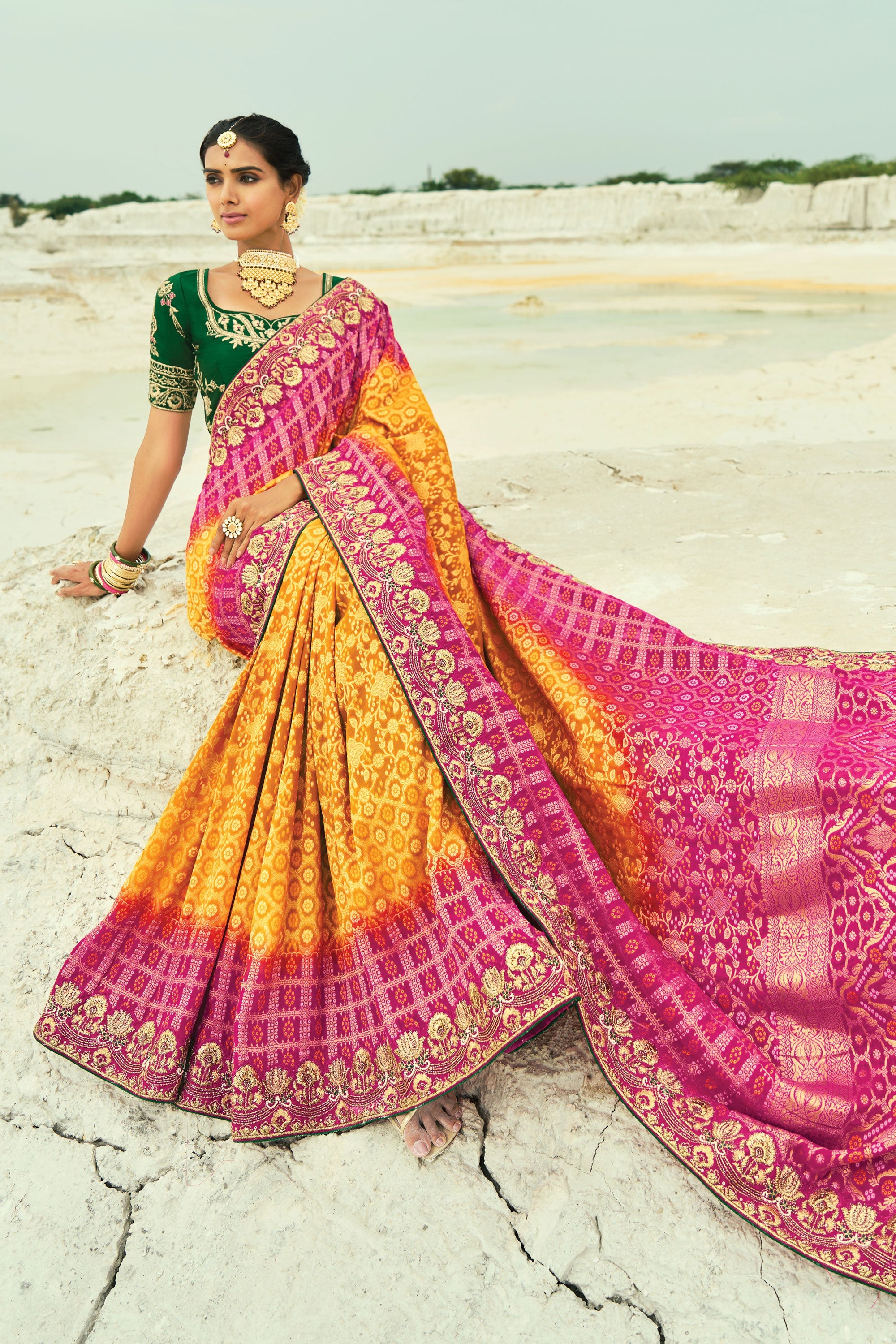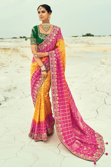 Premium Mustard And Rani Pure Georgette Bandhani Saree With Heavy Hand Border