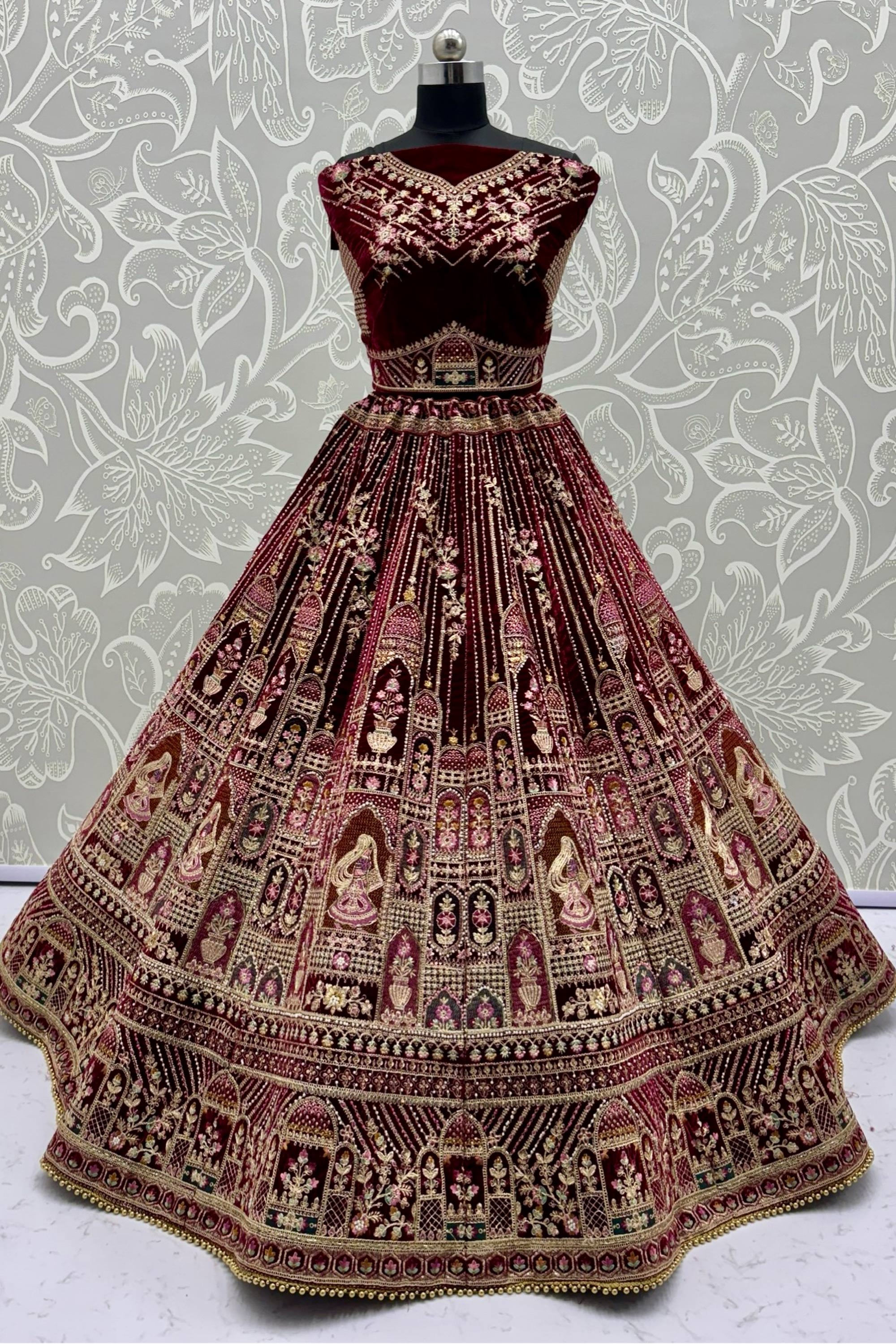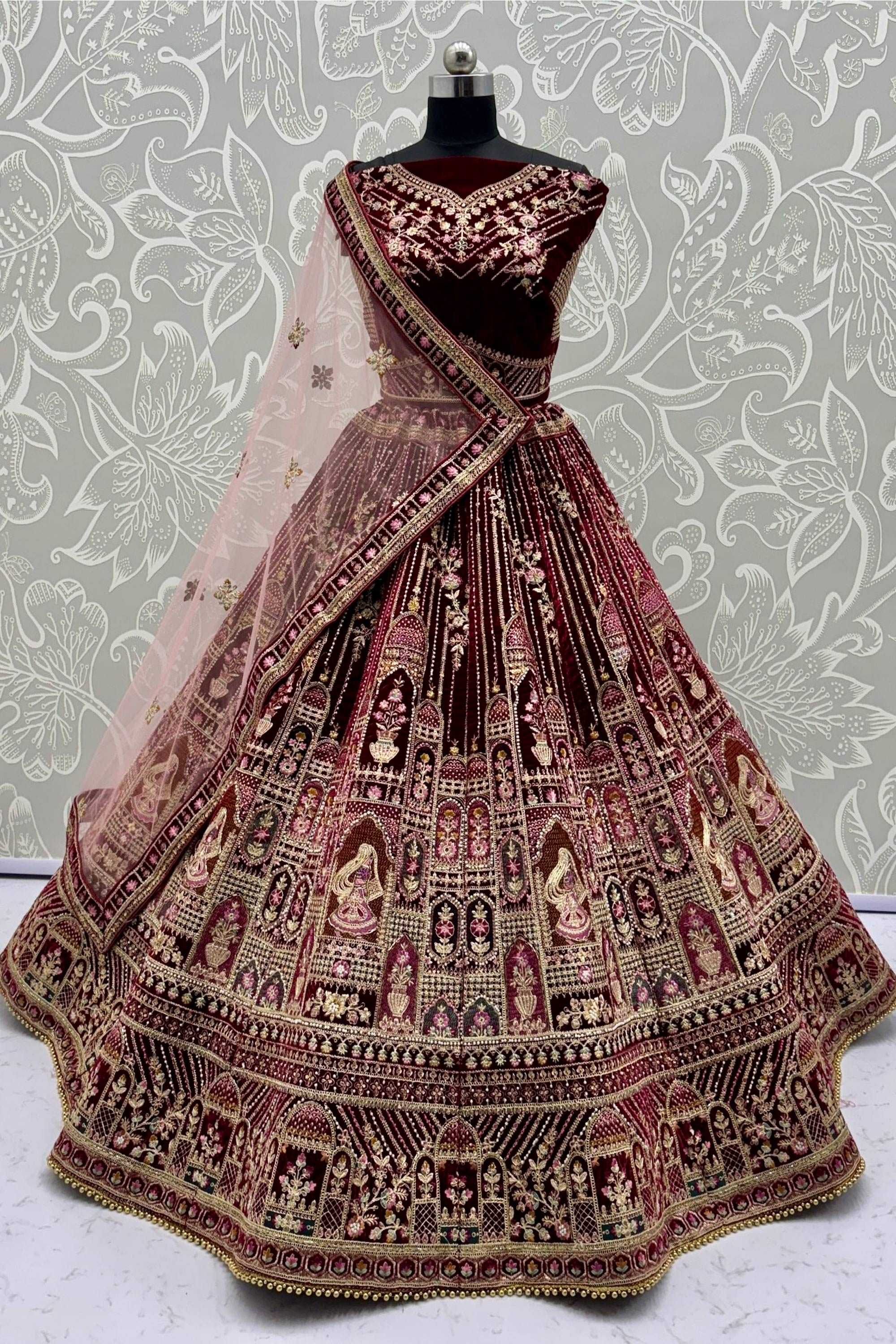 Maroon Velvet Heavy Embroidered Bridal Lehenga Choli
