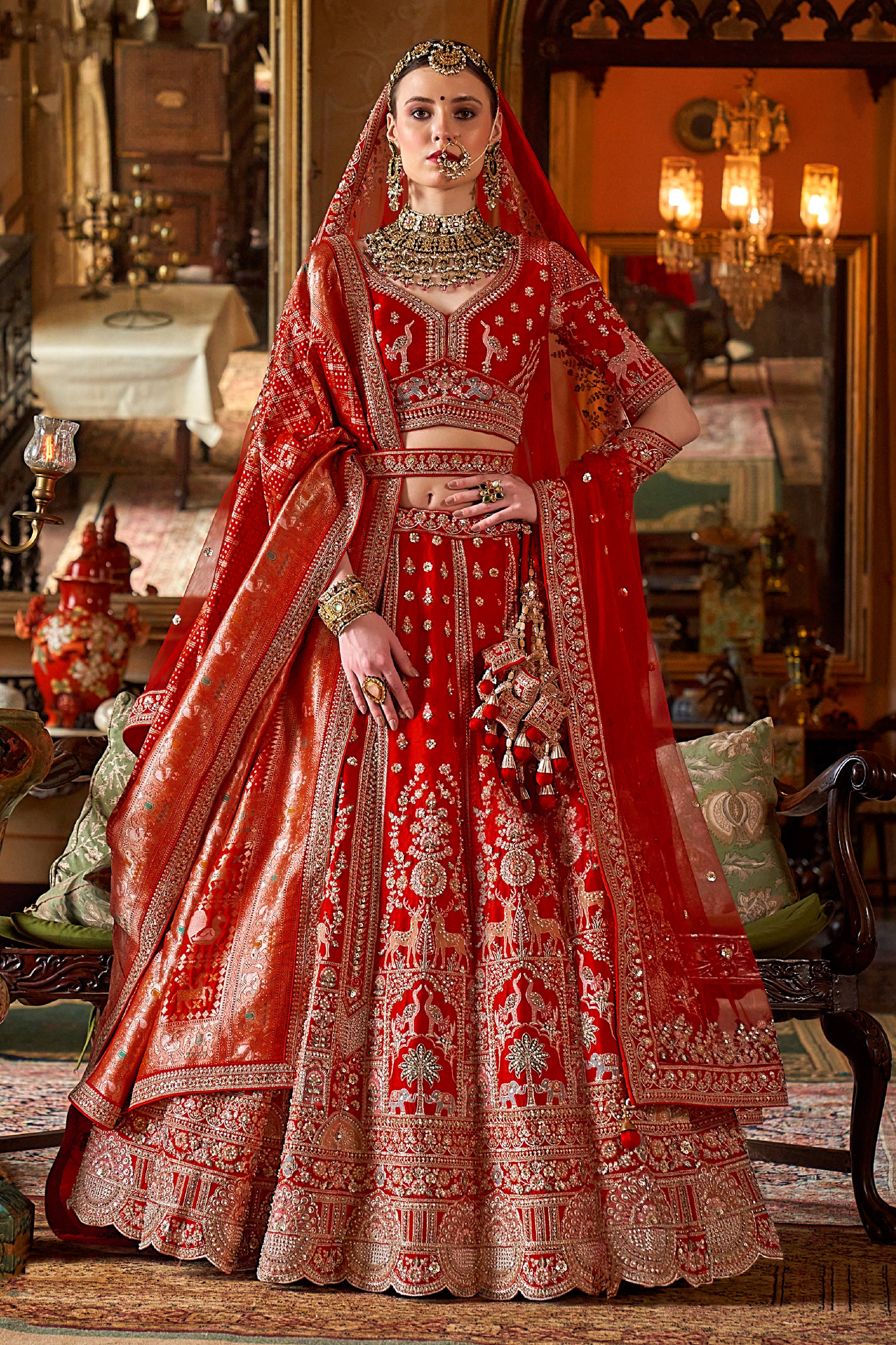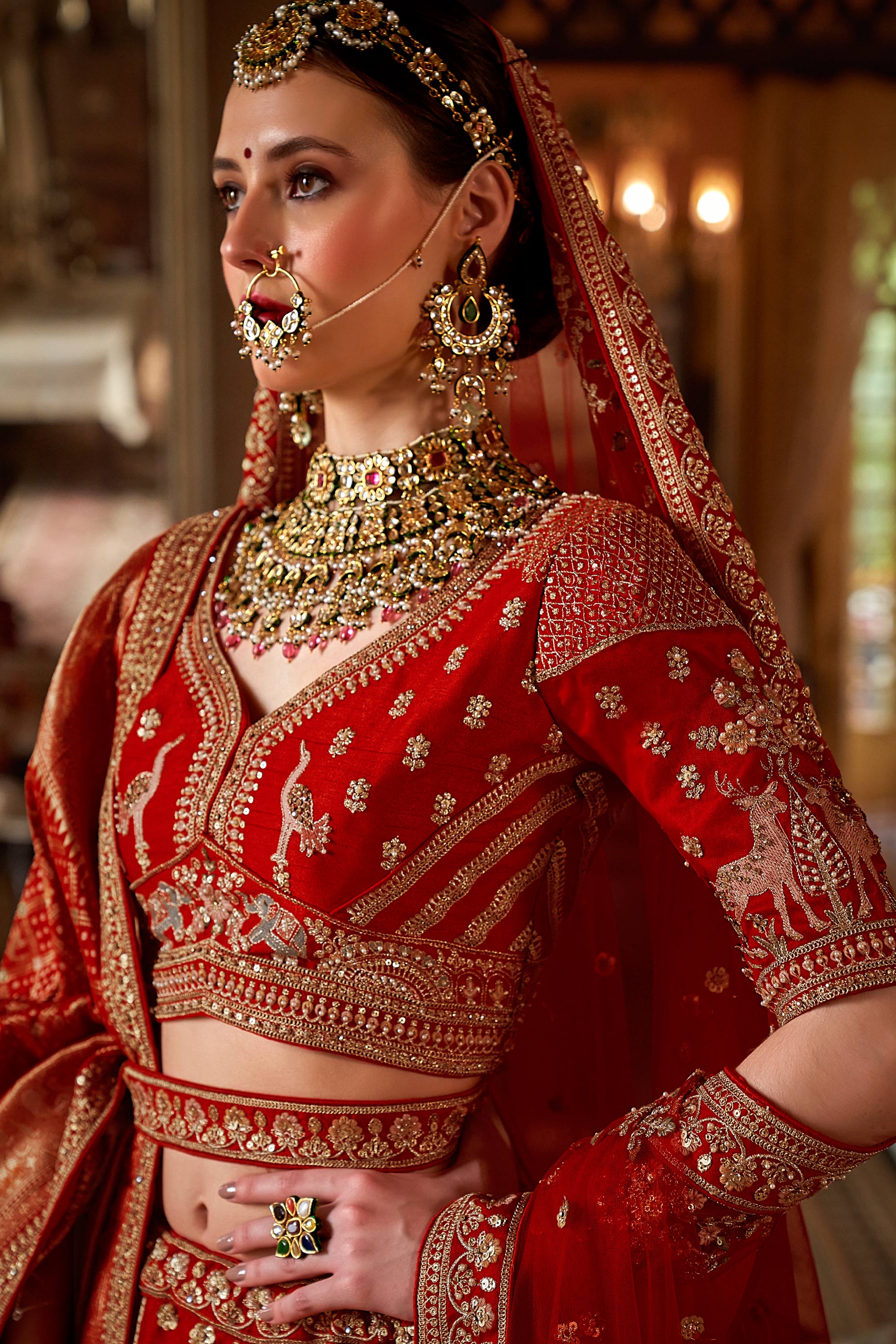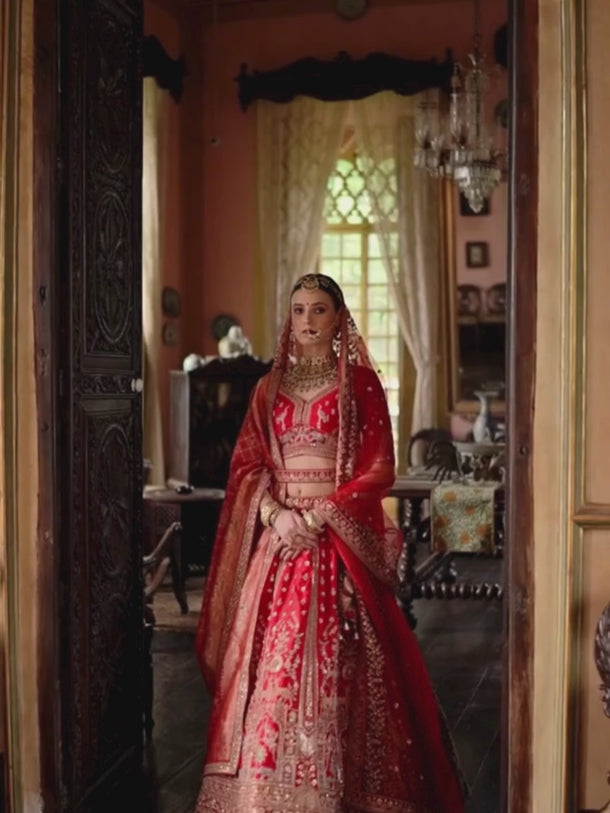 Step into elegance with this beautifully designed bridal lehenga. Crafted with intricate embroidery and detailed patterns, it radiates charm and grace for your special day. The blouse is tailored to complement the lehenga perfectly, offering both comfort and style. Whether it's for a traditional ceremony or an evening celebration, this ensemble promises to turn heads and make lasting impressions. Available in various sizes and designed for a perfect fit, this outfit is made to bring sophistication to every bride.