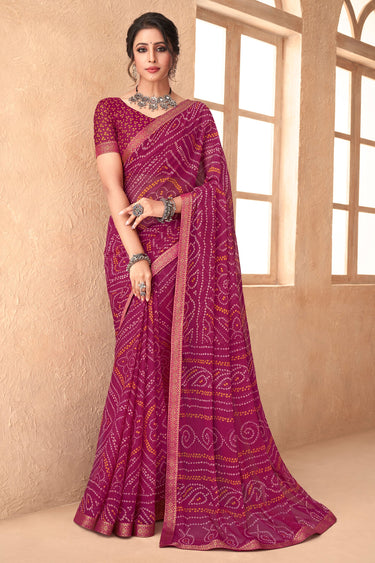 Bandhani Print Attached Banarasi Border Casual Saree In Magenta Color