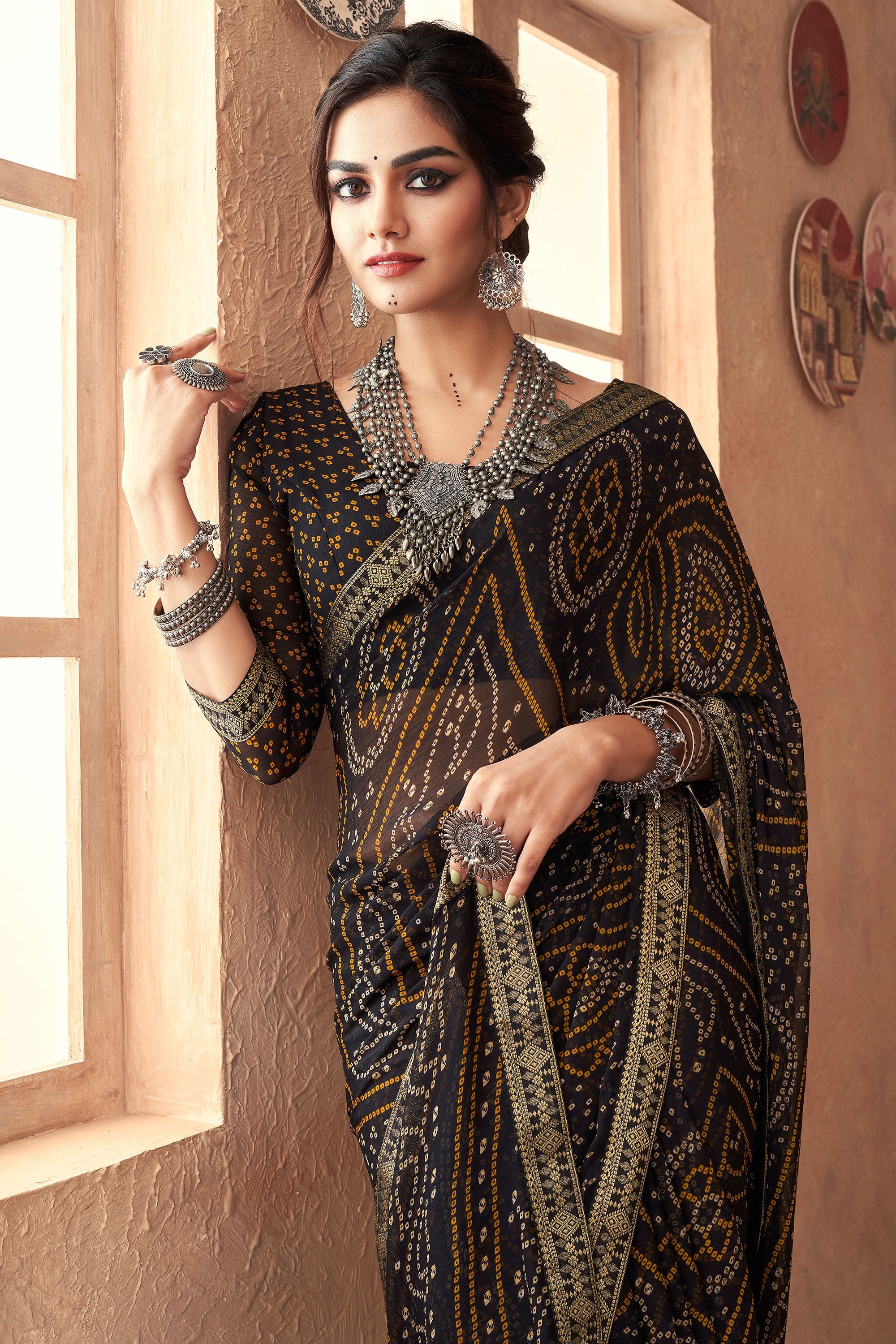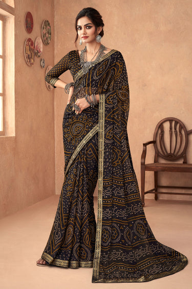 Black Bandhani Print Attached Banarasi Border Chiffon Saree