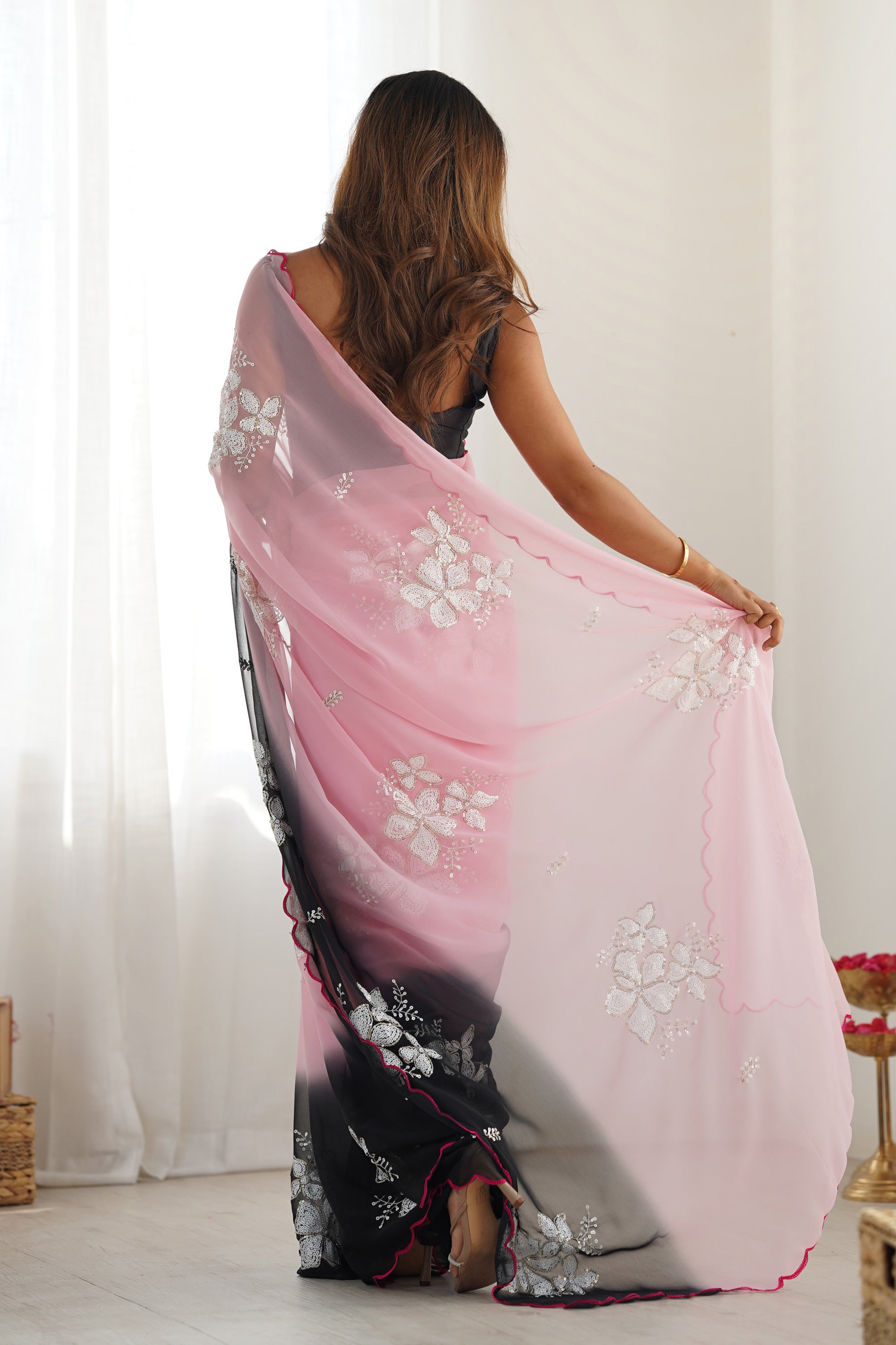 Majestic Pink Sequins Work Casual Wear Saree
