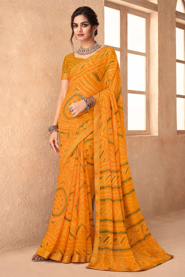 Yellow Bandhani Print Attached Banarasi Border Chiffon Saree