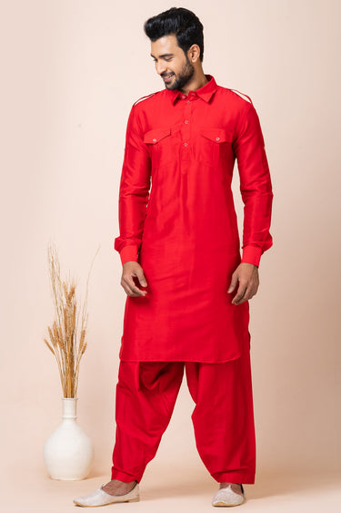Classic Viscose Fabric Red Color Pathani Kurta Pyjama Set For Function