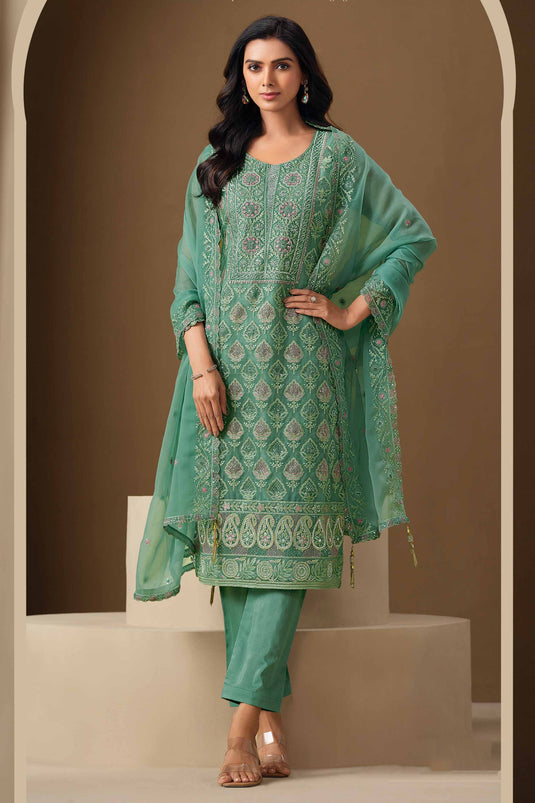 Rs. 4,900.00Rs. 9,800.00 Original Price Save 50%/ Embroidered Sea Green Georgette Readymade Straight Cut Salwar SuitSave 50%