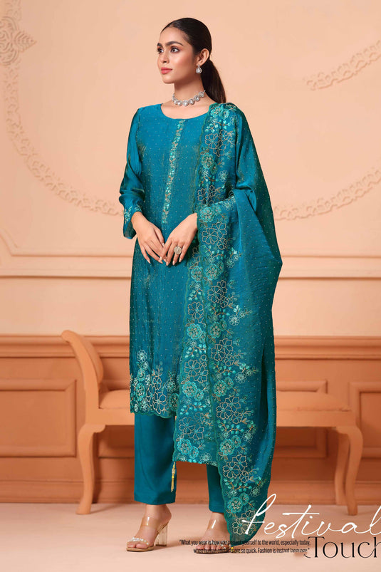 Rs. 6,200.00Rs. 12,400.00 Original Price Save 50%/ Cyan Art Silk Fancy Embroidered Function Wear Readymade Designer Salwar SuitSave 50%