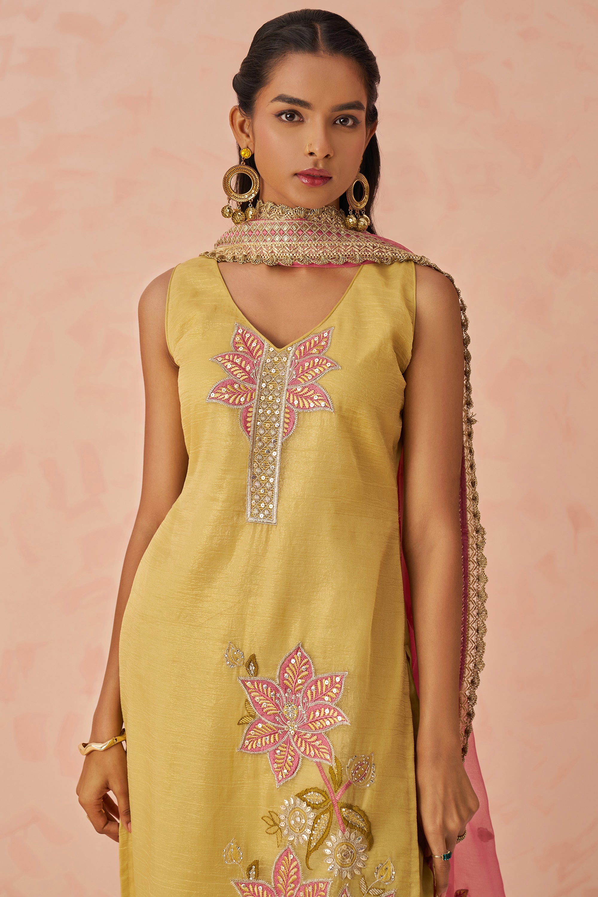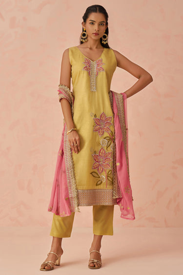 Yellow Designer Fancy Crush Fabric Readymade Straight Cut Suit With Embroidery Work