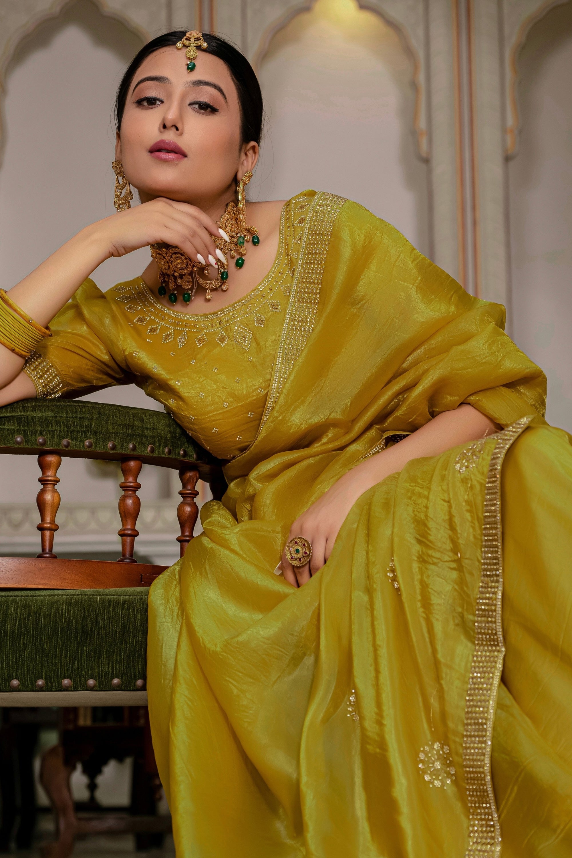 Yellow Party Wear Fancy Fabric Stone Work Saree
