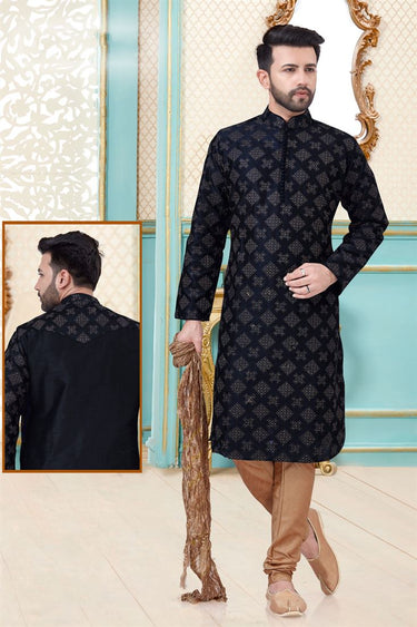 Black Color Art Silk Fabric Embroidered Sangeet Wear Men Kurta Pyjama
