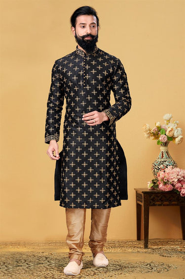 Black Color Art Silk Fabric Wedding Wear Embroidered Readymade Kurta Pyjama For Men