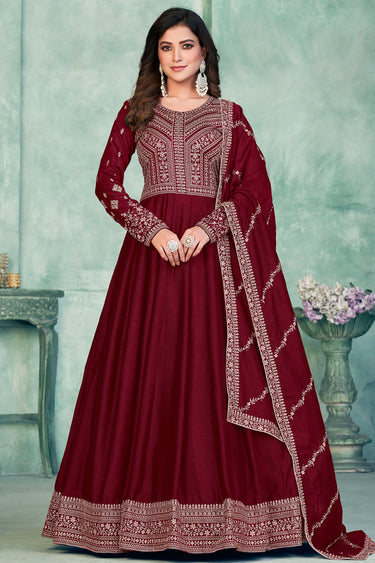 Embroidered Sangeet Wear Long Anarkali Salwar Kameez In Art Silk Fabric Maroon Color