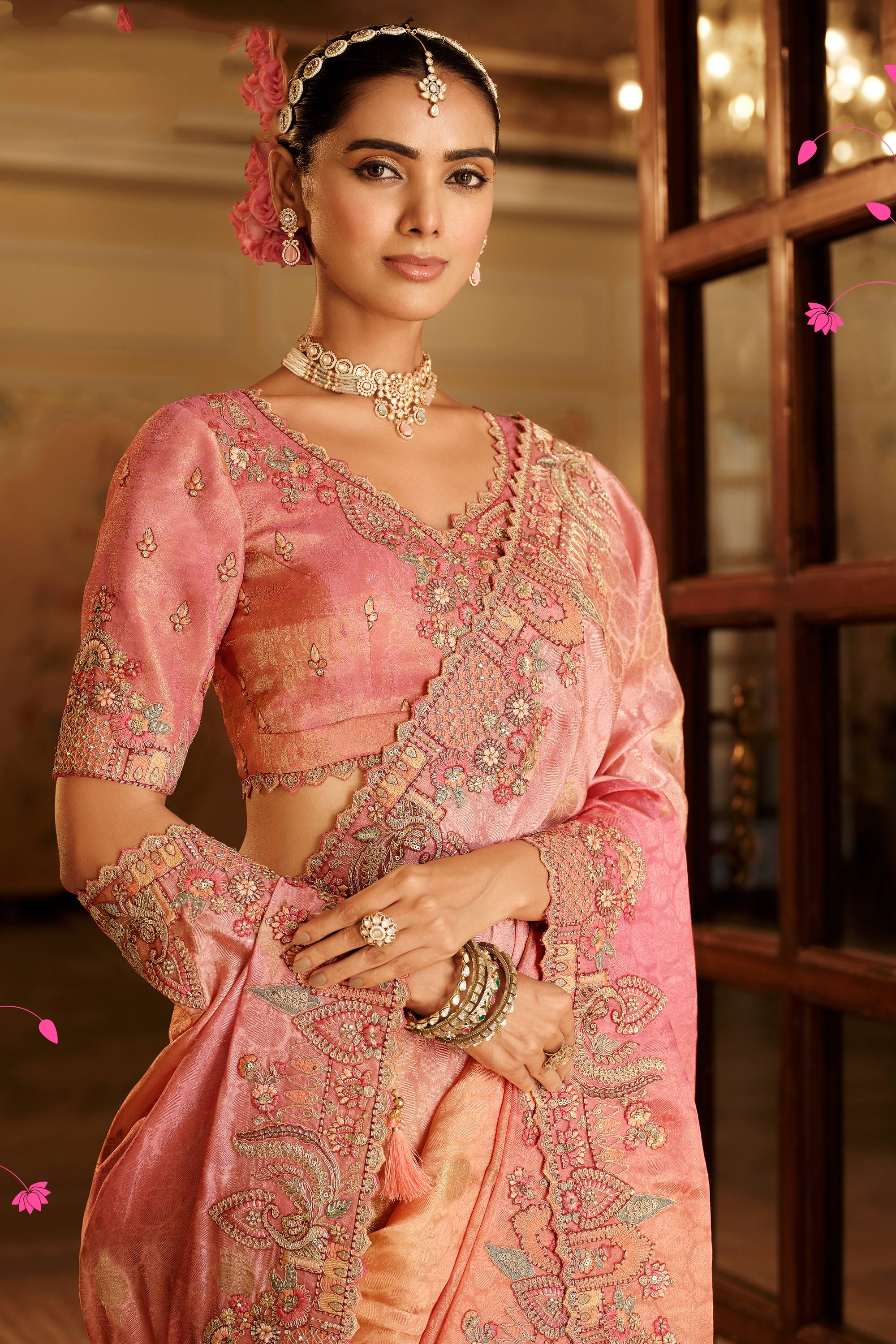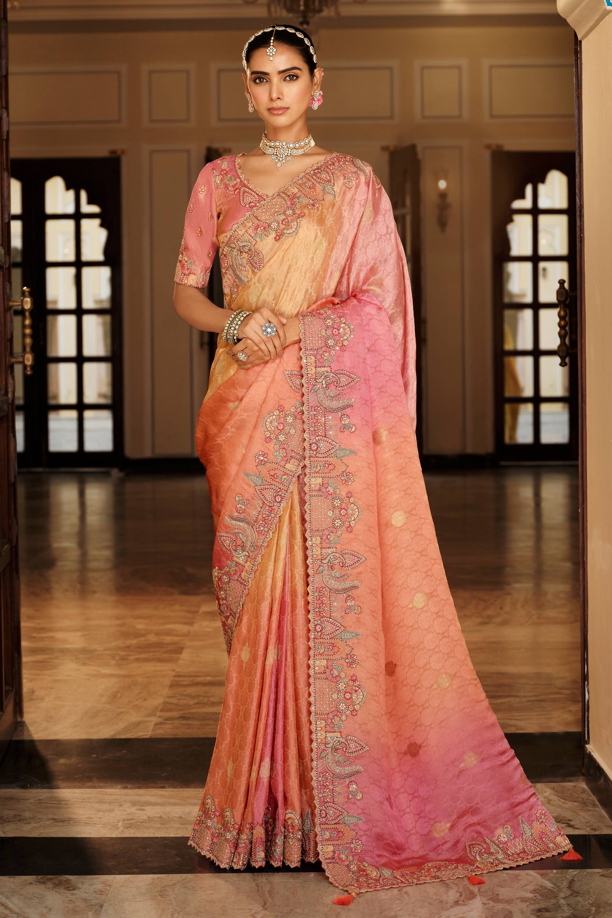 Peach Viscose Jacquard Embroidered Border Work Function Wear Saree