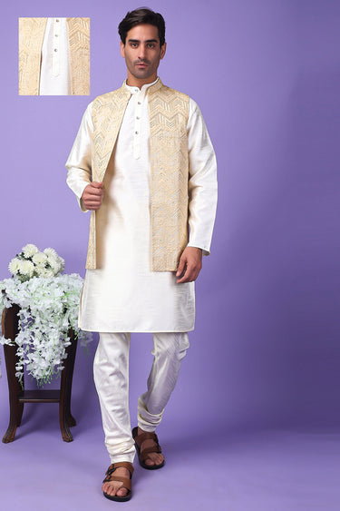 Art Silk Beige Color Wedding Wear Readymade Designer Men Kurta Pyjama With Modi Jacket