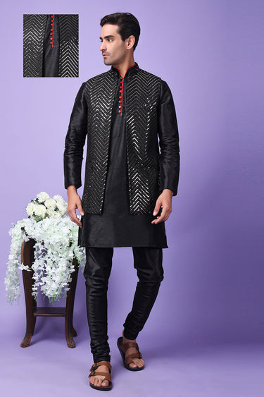 Black Color Sangeet Wear Readymade Lovely Art Silk Fabric Kurta Pyjama For Men With 3 Pcs Embroidered Jacket Set