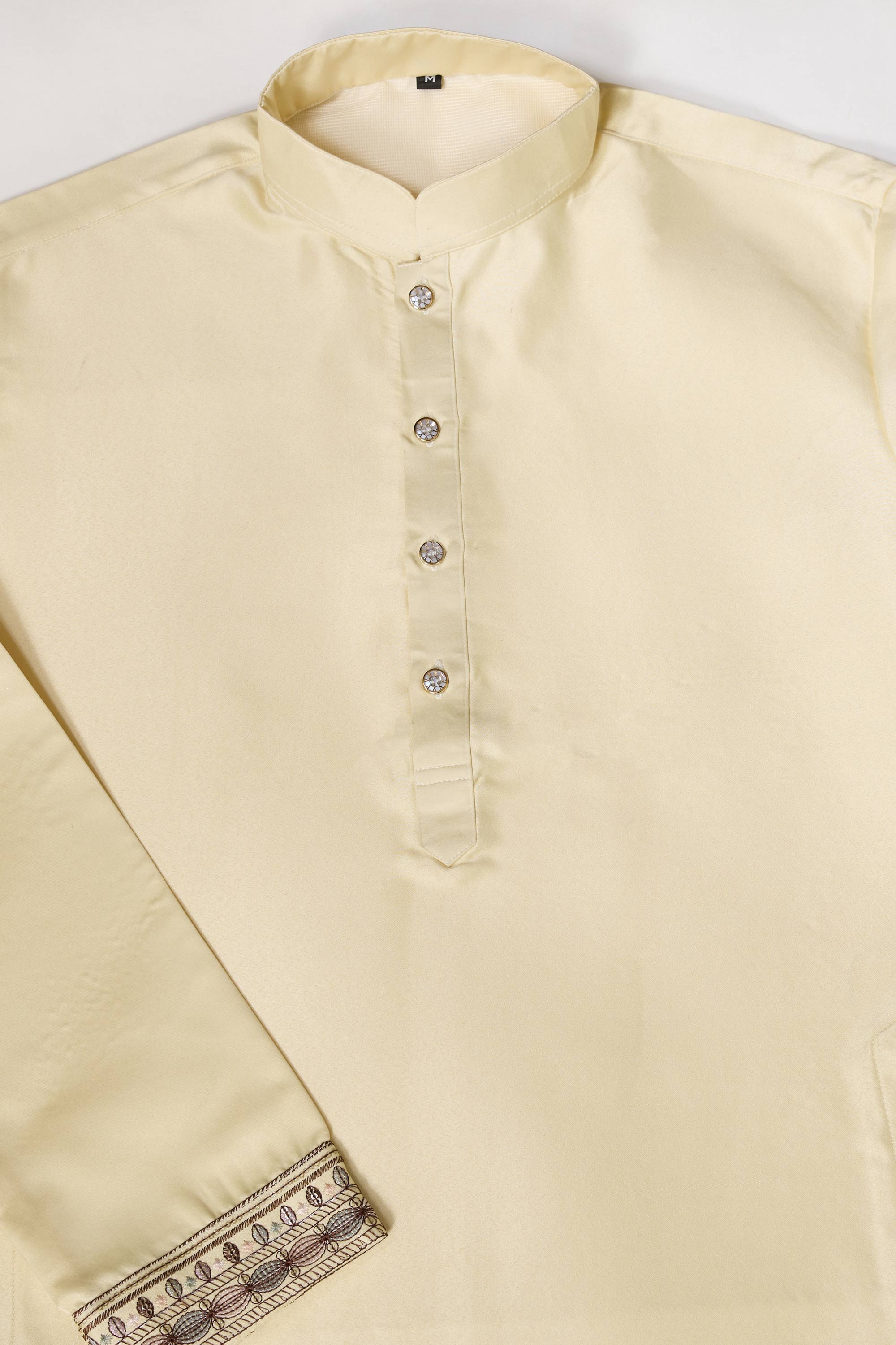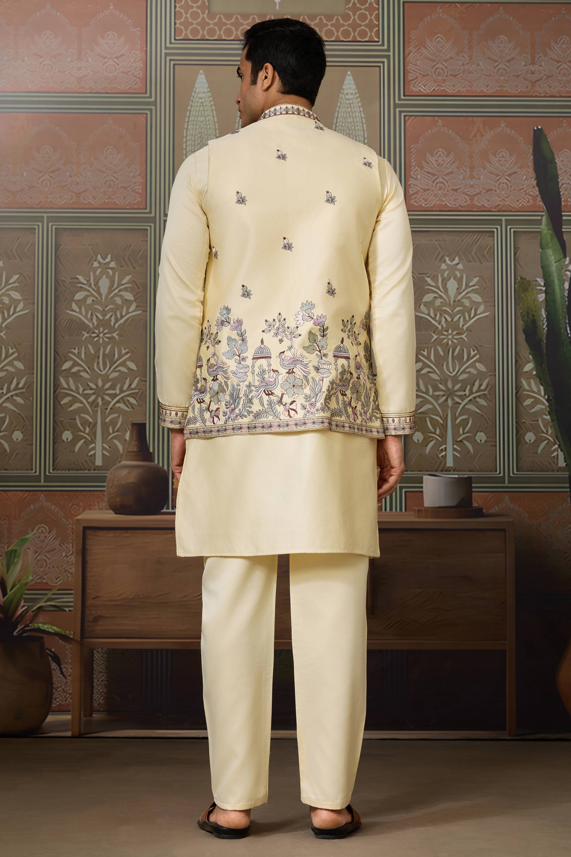 Lovely Art Silk Yellow Readymade Kurta Pyjama For Men With 3 Pcs Jacket Set