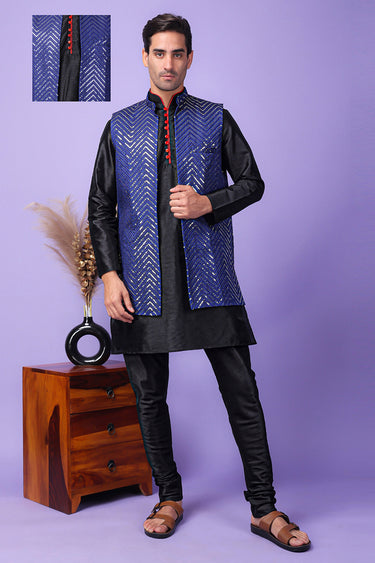 Reception Wear Readymade Black Color Art Silk Fabric Beautiful Kurta Pyjama For Men With 3 Pcs Embroidered Jacket Set