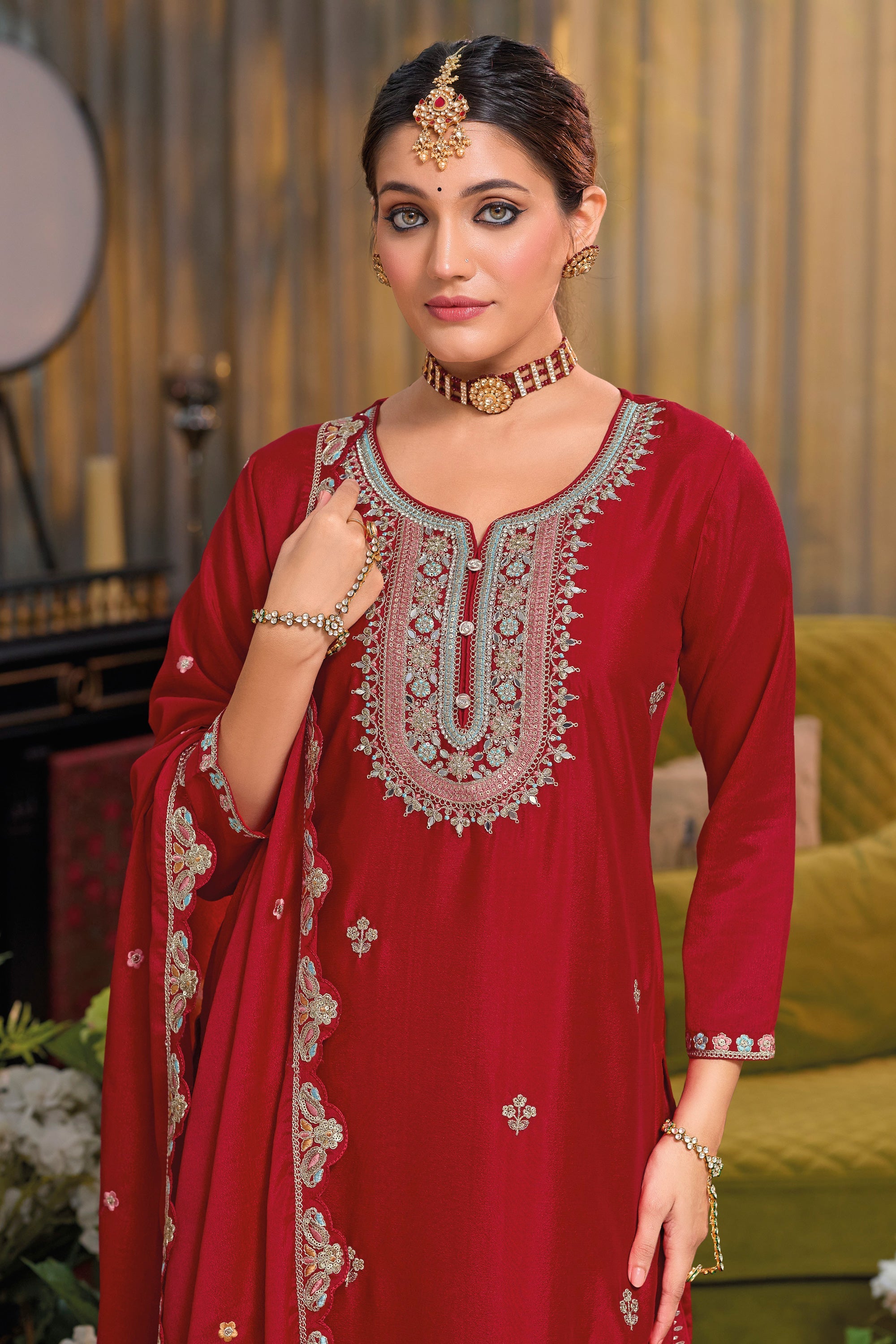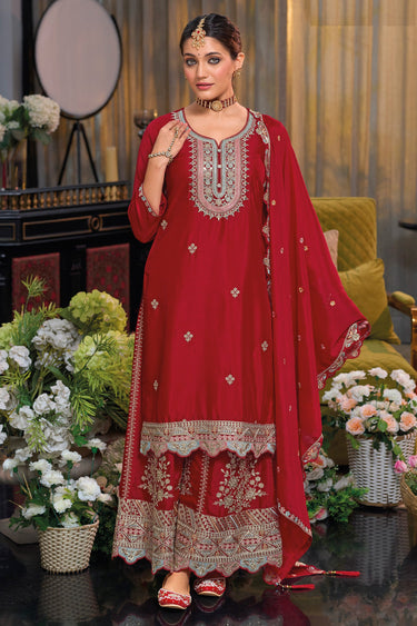 Experience timeless elegance with our Embroidered Chinon Reach Color Readymade Palazzo Suit. This beautifully crafted ensemble is designed to bring a touch of sophistication to any occasion. The delicate embroidery work adds a charming flair to the rich fabric, making it perfect for both casual outings and festive events. Made from high-quality Chinon, the suit is lightweight, comfortable, and effortlessly chic. The set includes a finely stitched kurta, a stylish palazzo, and a matching dupatta to complete your look. Available in multiple sizes to ensure a perfect fit. Elevate your wardrobe with this stunning outfit.