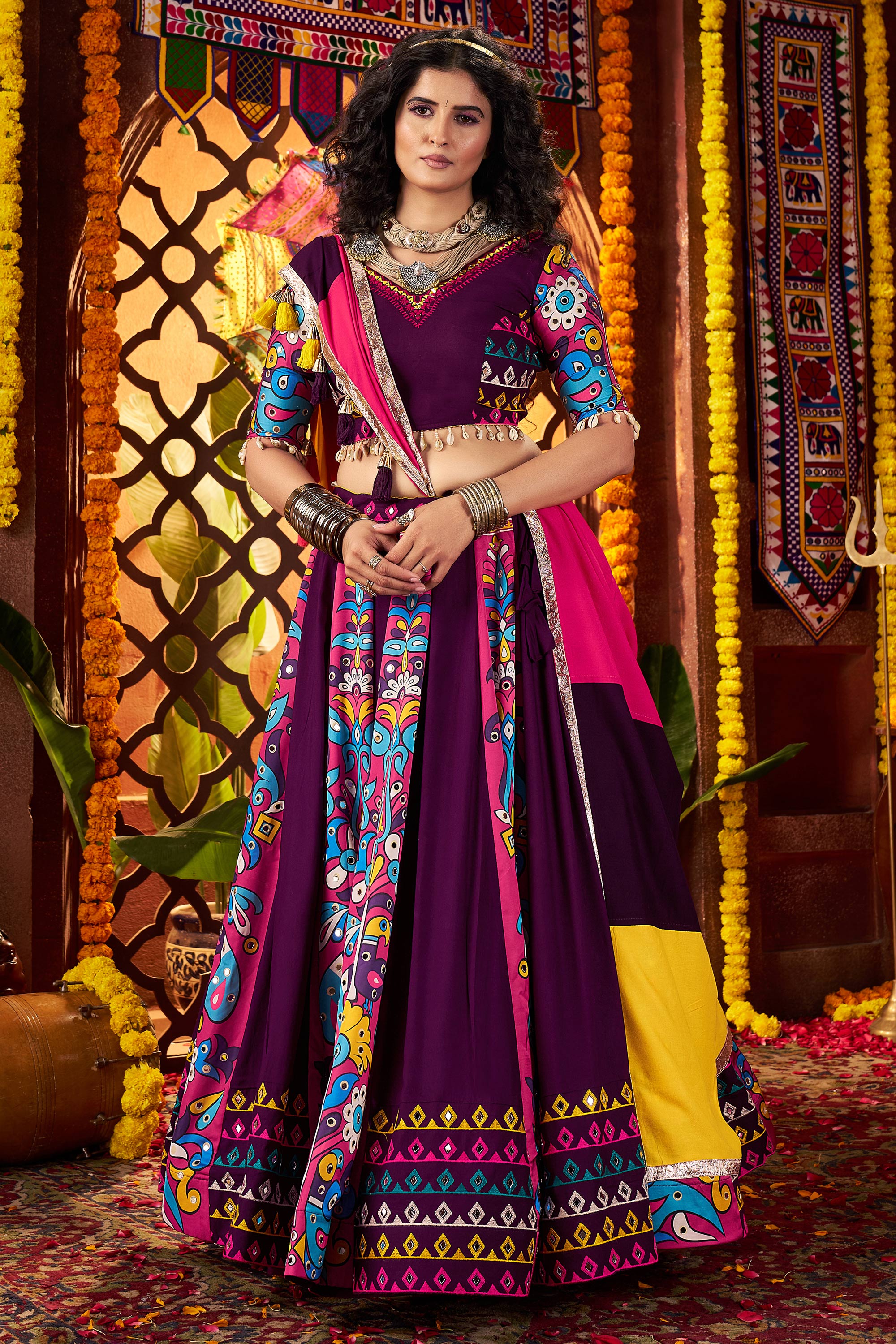 Beautiful Navratri Special Real Mirror Work Lehenga Choli is crafted to add grace to your festive celebrations. Featuring intricate mirror work detailing and a vibrant color palette, this lehenga choli is perfect for capturing the true essence of traditional festivities. The lightweight yet durable fabric ensures comfort for long hours of wear, while the exquisite design adds a regal touch to your look. Pair it with statement jewelry to complete your outfit and dazzle at garba nights, family gatherings, or any Navratri occasion. Available in multiple sizes, this set is tailored to complement different body types beautifully.