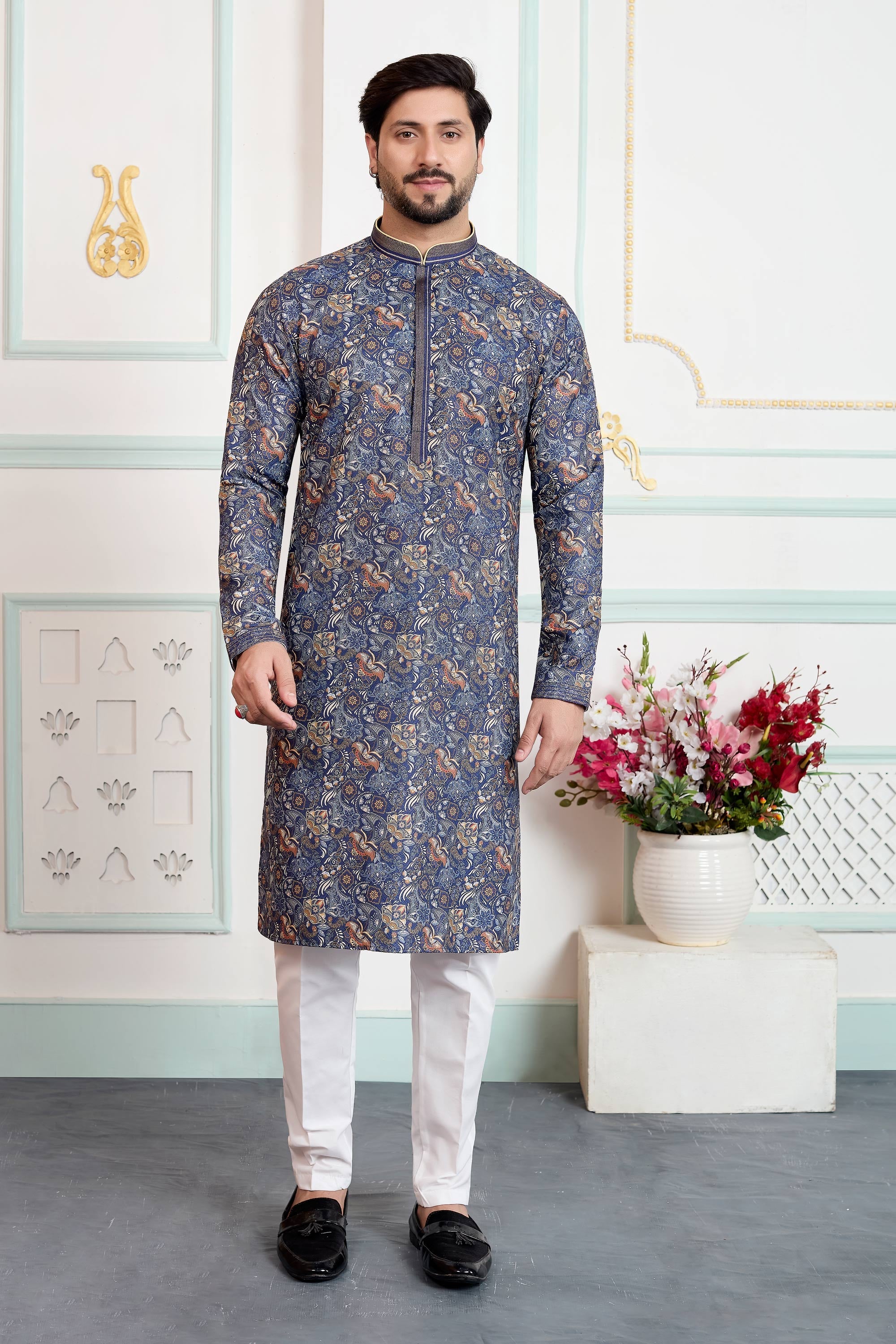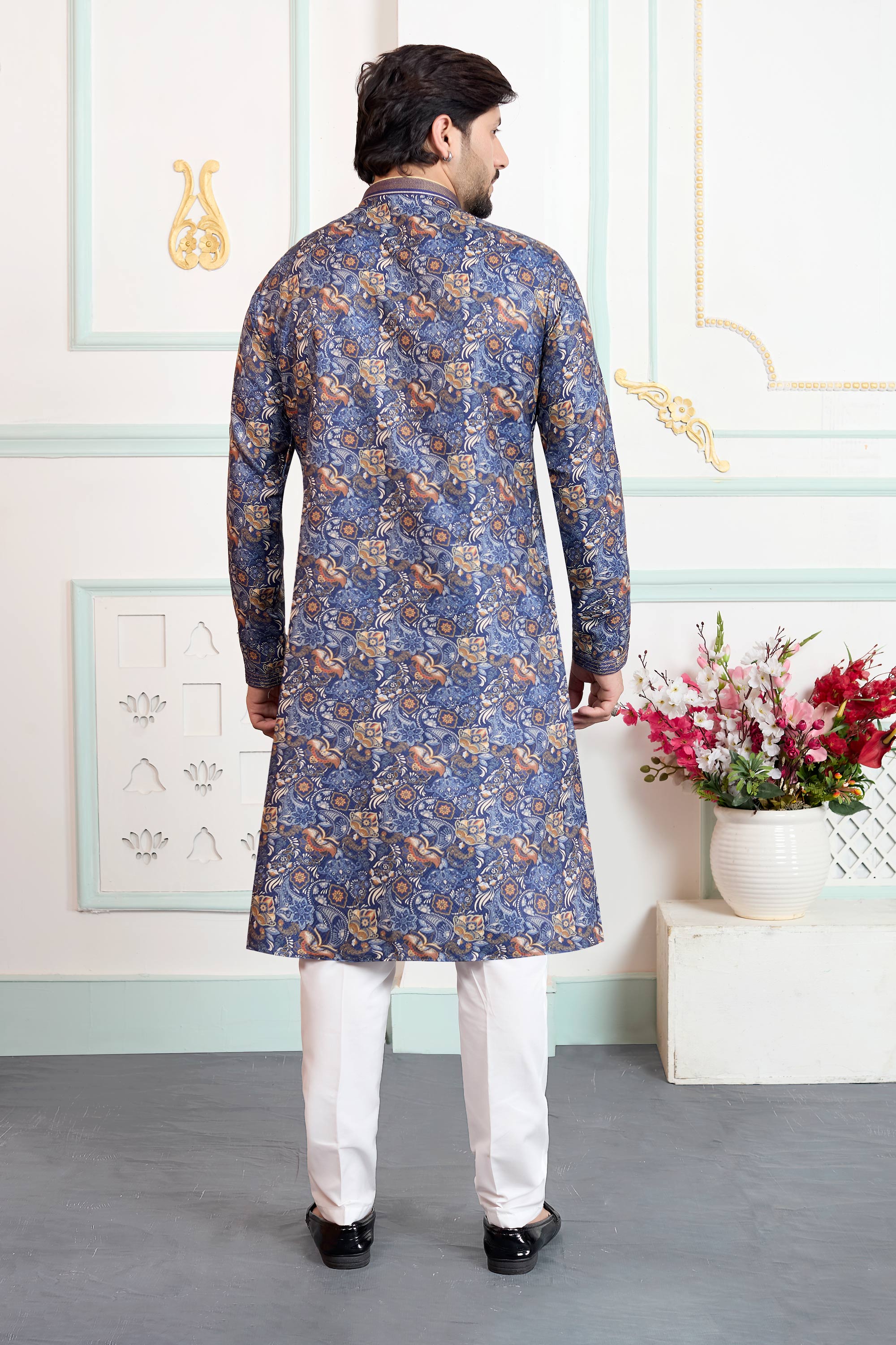 Blue Festive Wear Art Silk Fabric Readymade Kurta Pyjama For Men