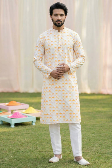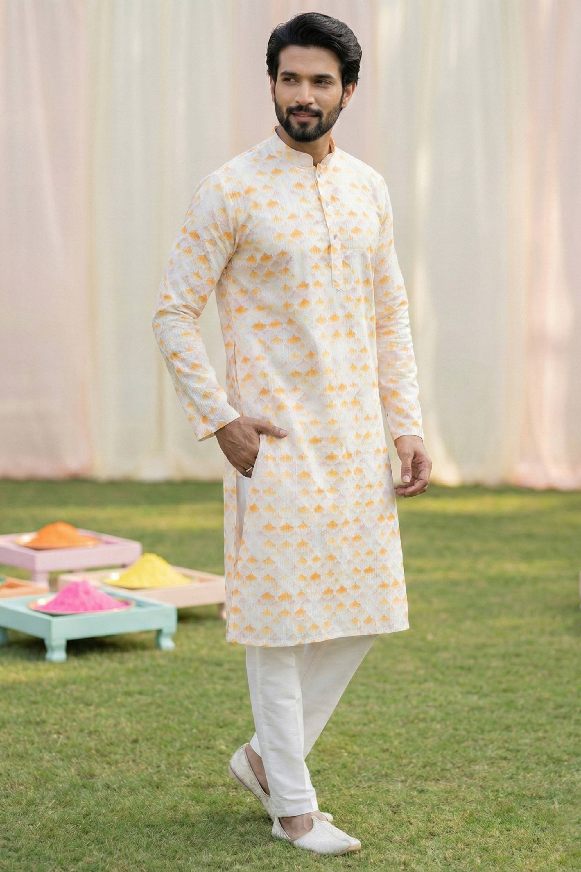 Cotton Fabric Printed Beige Readymade Kurta Pyjama For Men