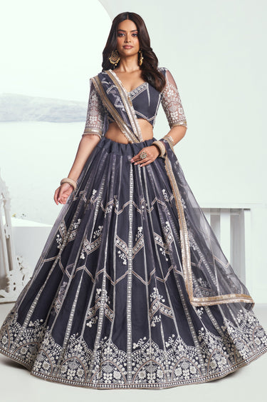 Embroidered Net Fabric Grey Color Sangeet Wear Lehenga Choli