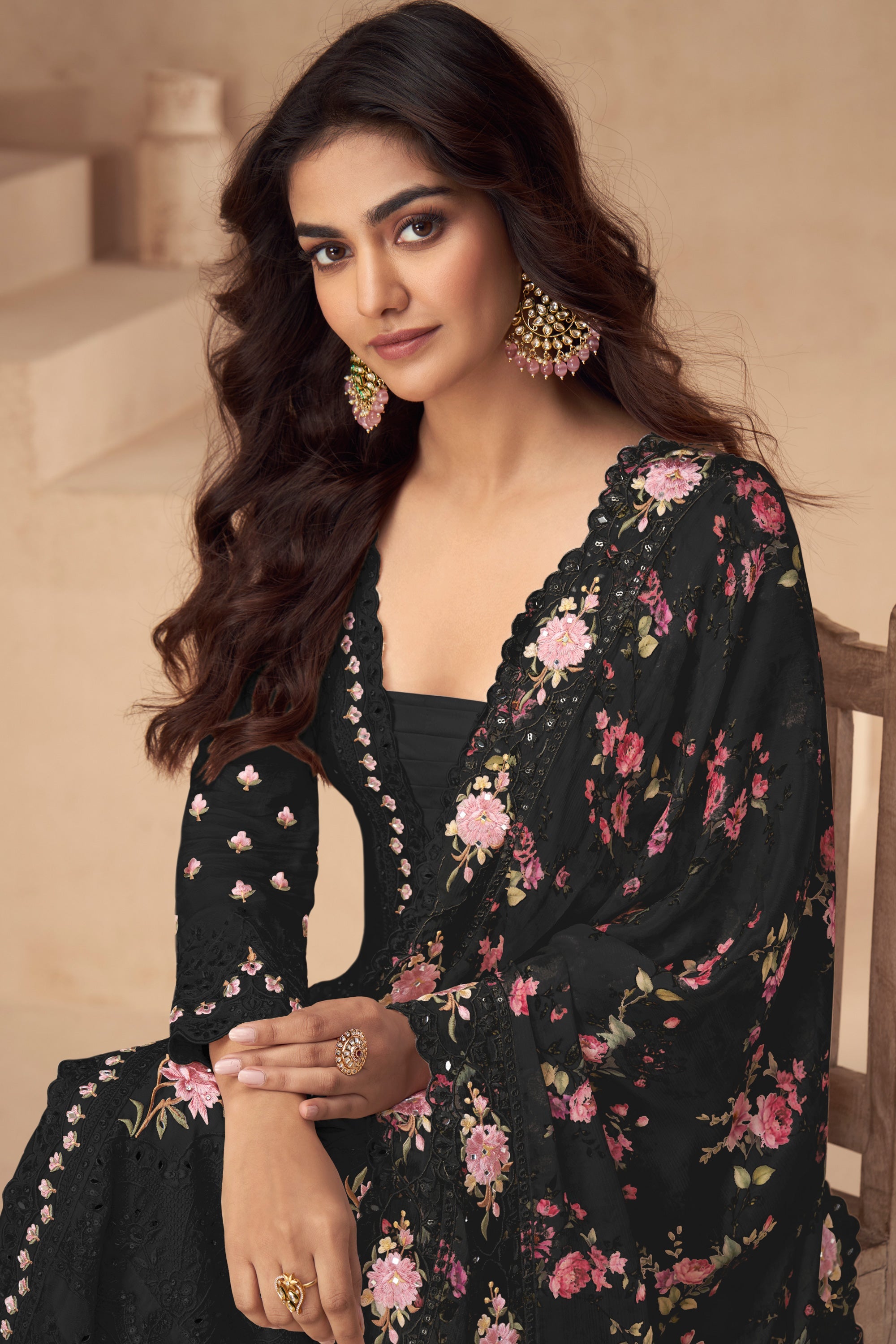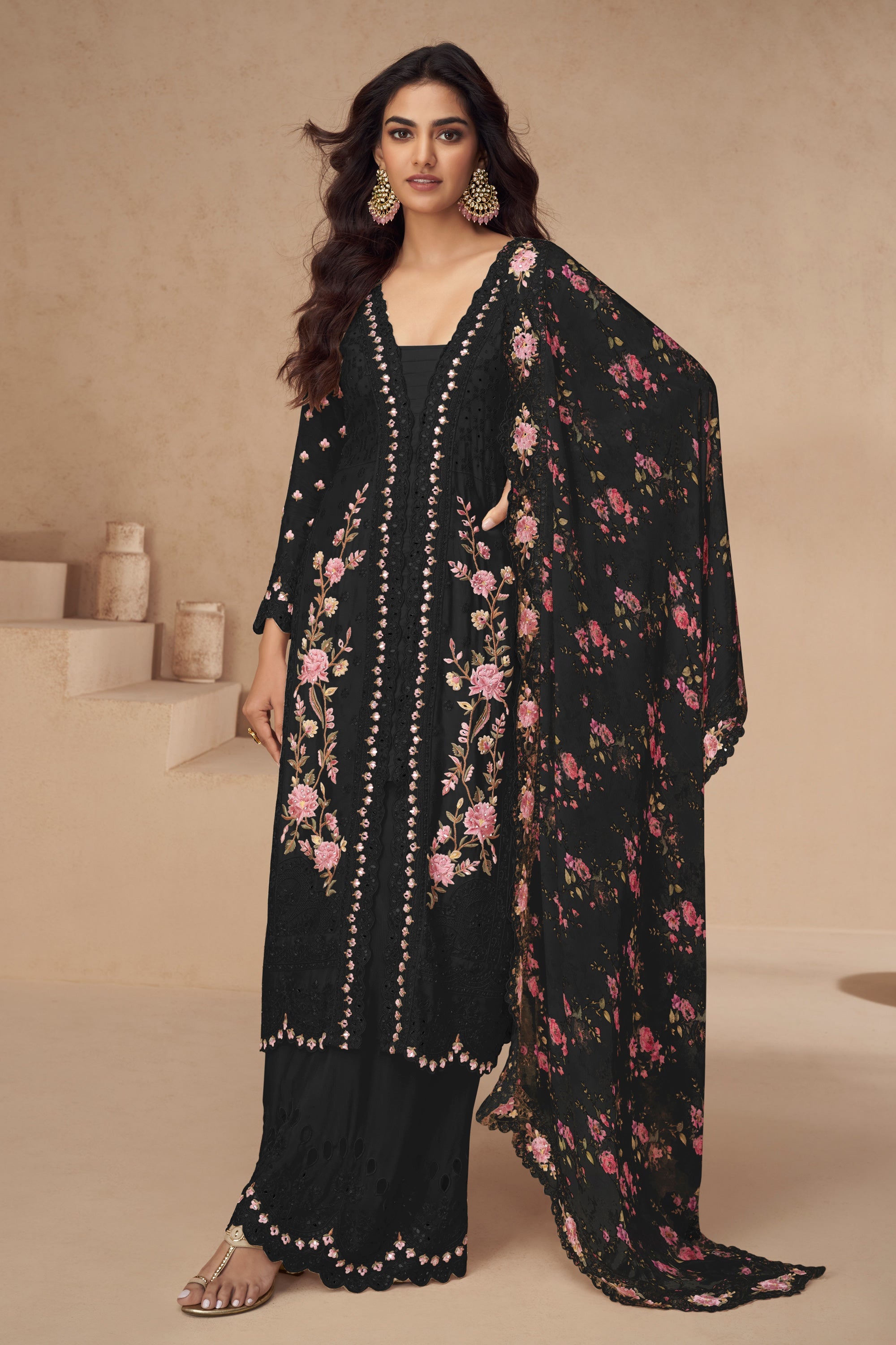 Black Festive Wear Chinon Silk Fabric Designer Palazzo Suit