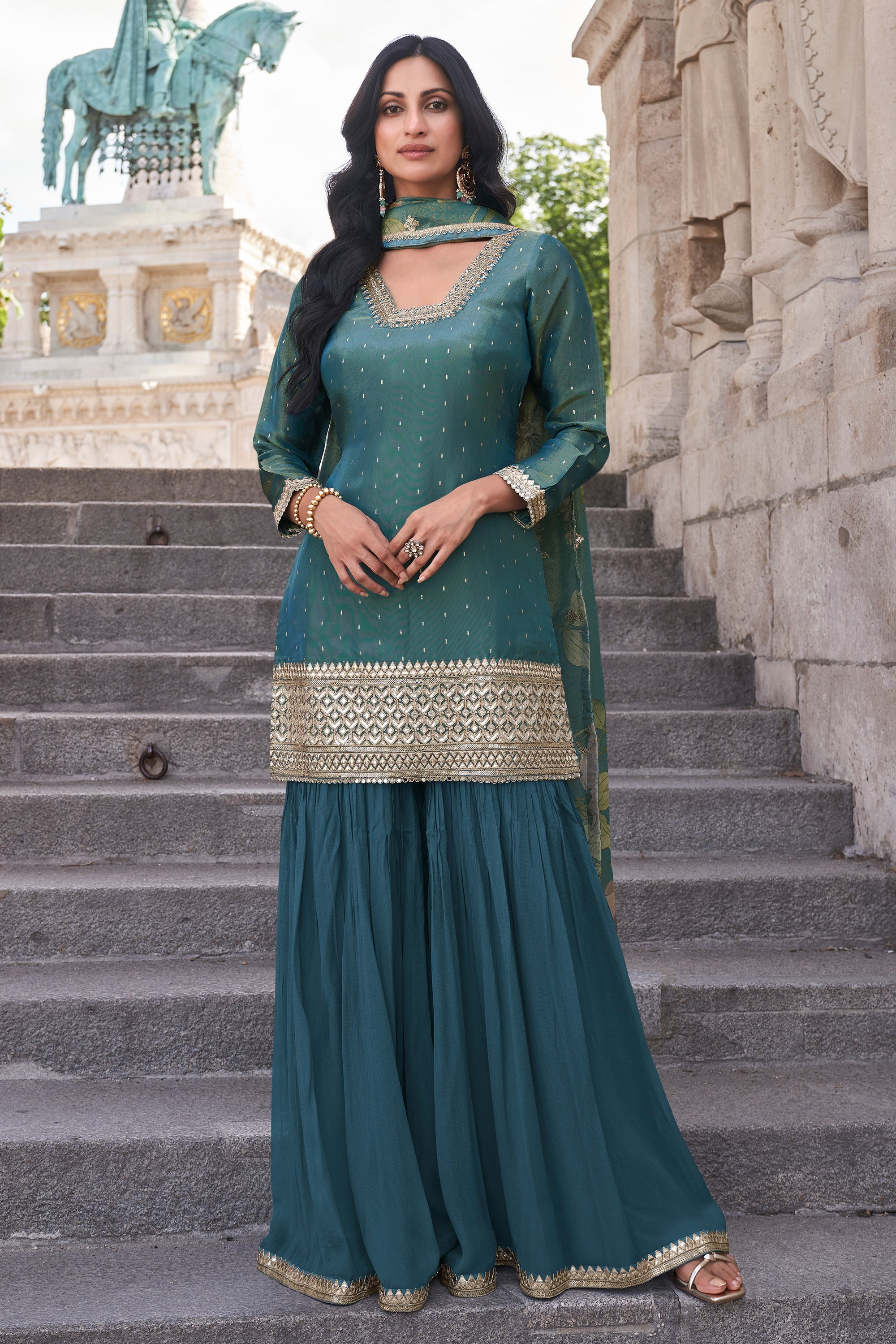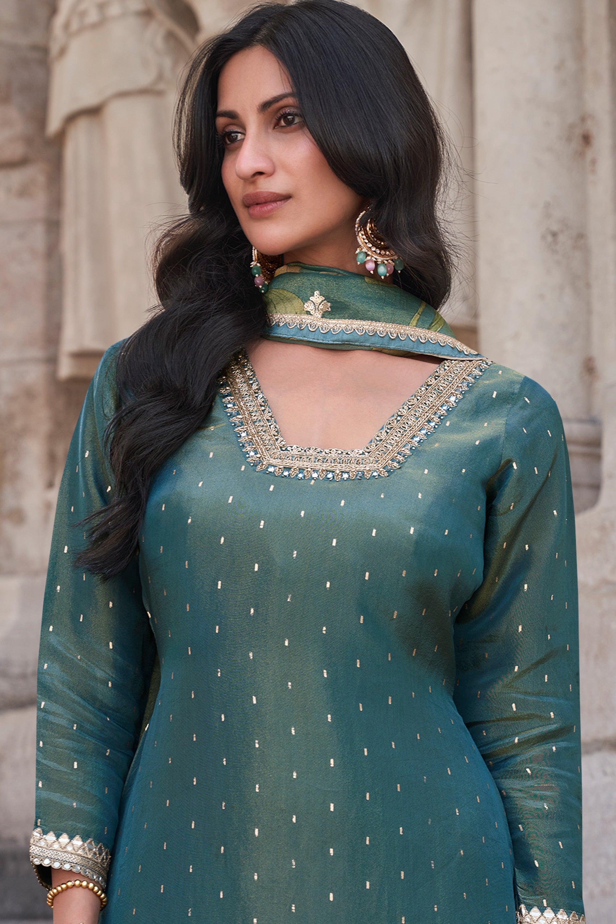 Embroidered Chinon Silk Readymade Palazzo Salwar Kameez In Teal Color