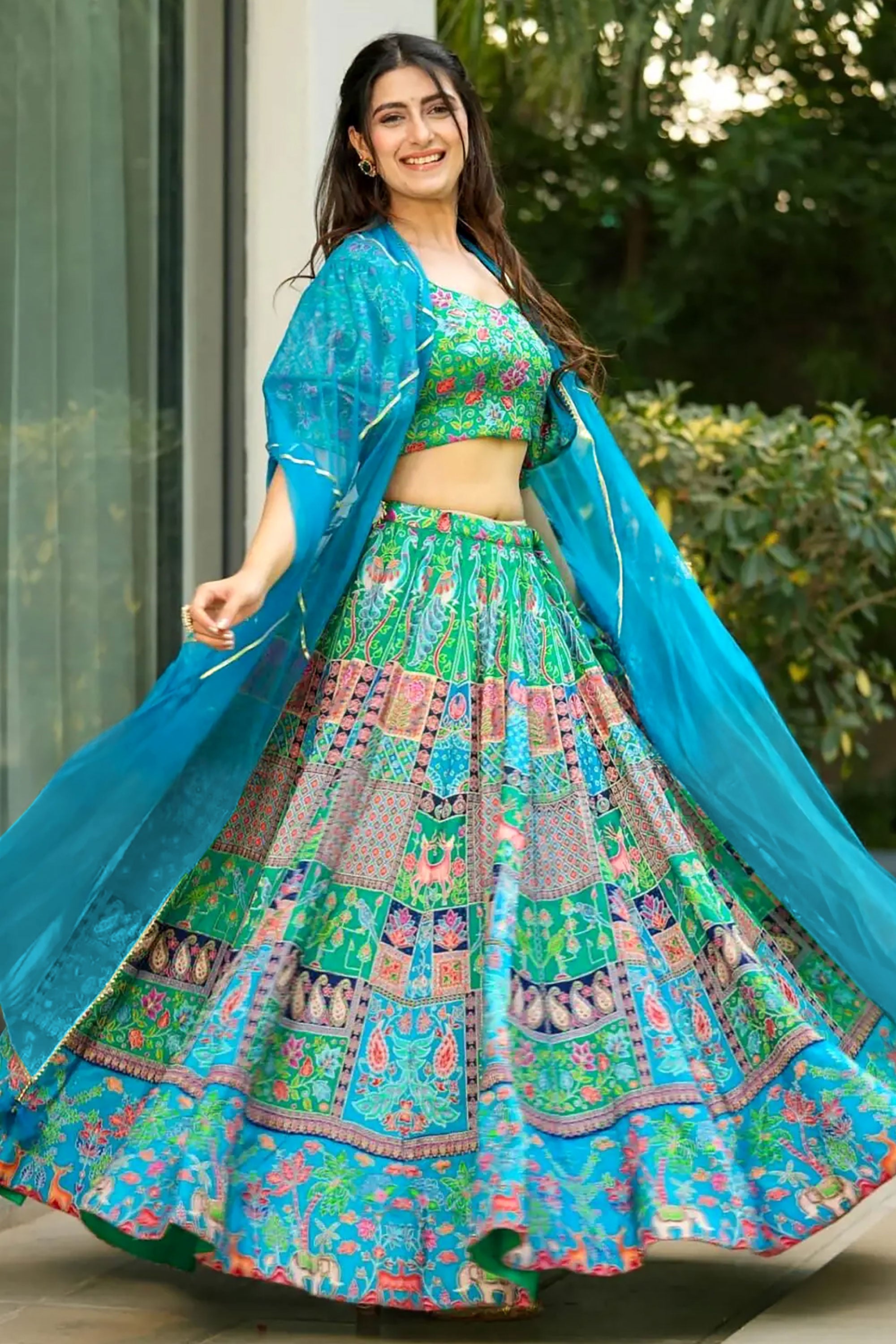 Printed Sea Green Festive Wear Readymade Crop Top Lehenga In Art Silk Fabric